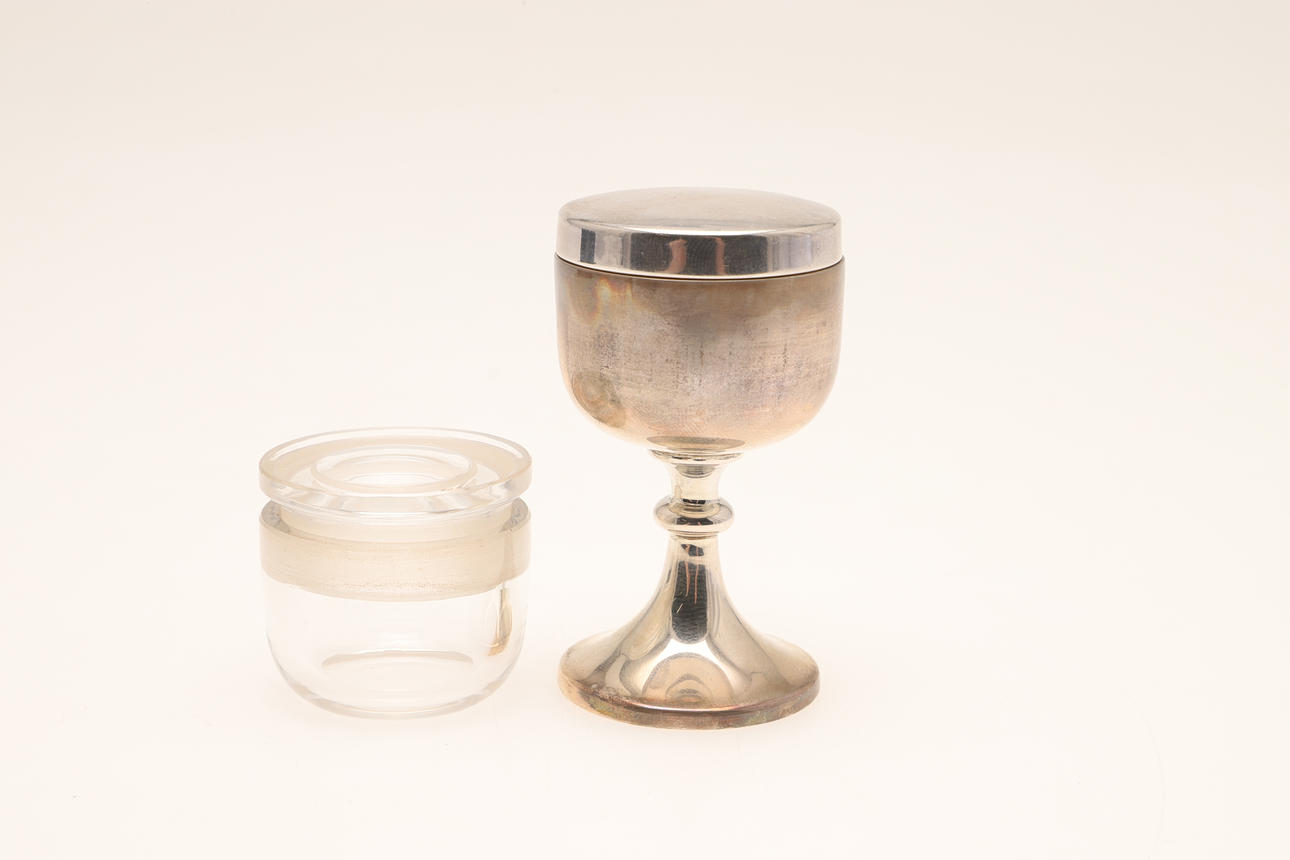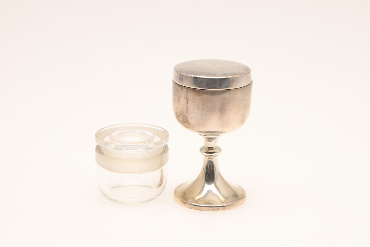 The cylindrical case to contain silver pyx and silver chalice with glass insert and top. Hallmarked A R Mowbray & Co Ltd, London, 1940. Case measures Height 11cm x Diameter 5.5cm. Total silver weight 2.6ozt.