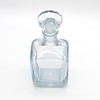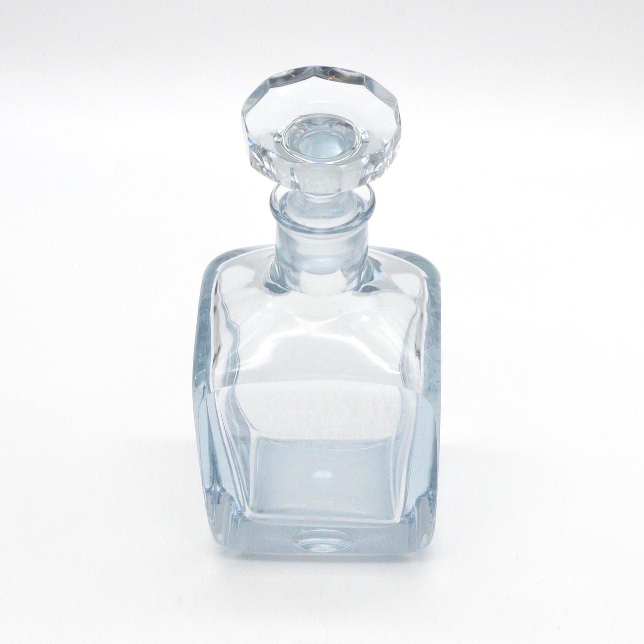 Decanter with a light blue crystal glass stopper, manufactured in Scandinavia, around the middle of the 20th century. The decanter has a rectangular basic shape. The plug is round at the top and faceted on the sides.