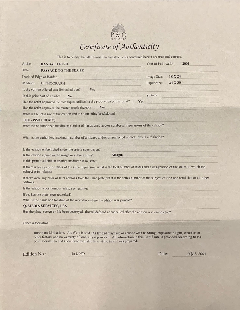 4427801. RANDAL LEIGH. LIMITED EDITION LITHOGRAPH.