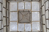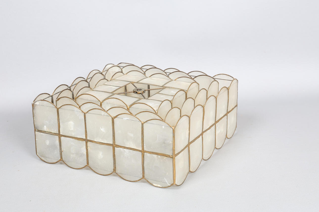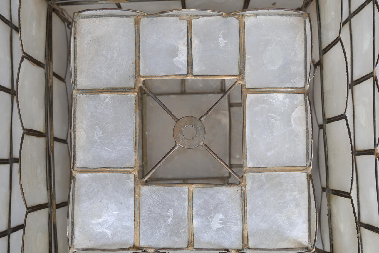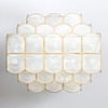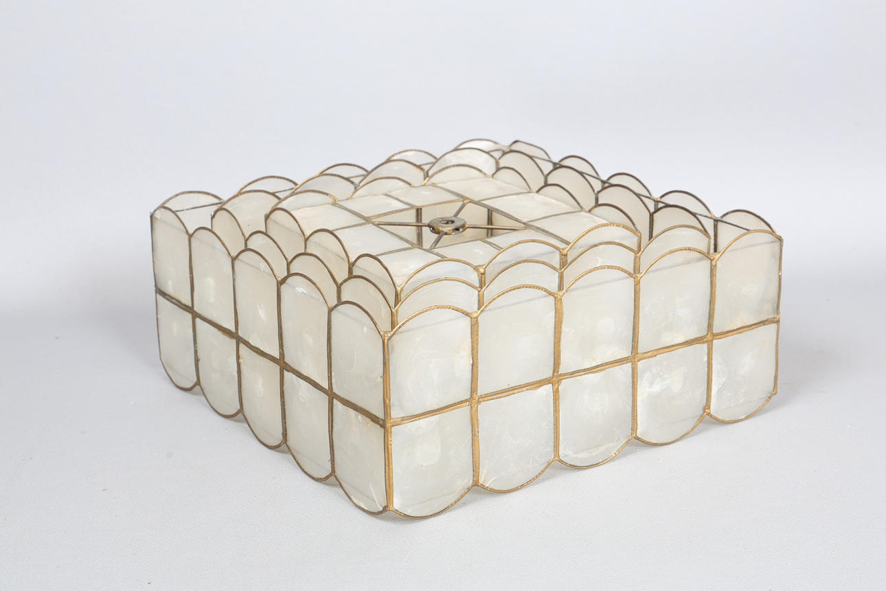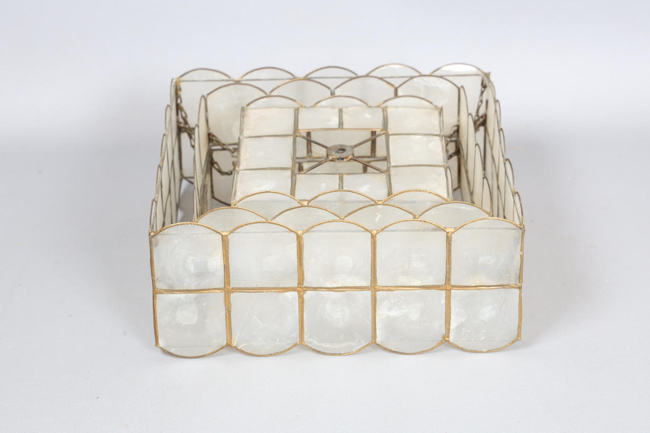 The 20th Century ceiling light shade with five tiers of seashell and brass framed panels, 29cm x 29cm x 27cm when hanging.