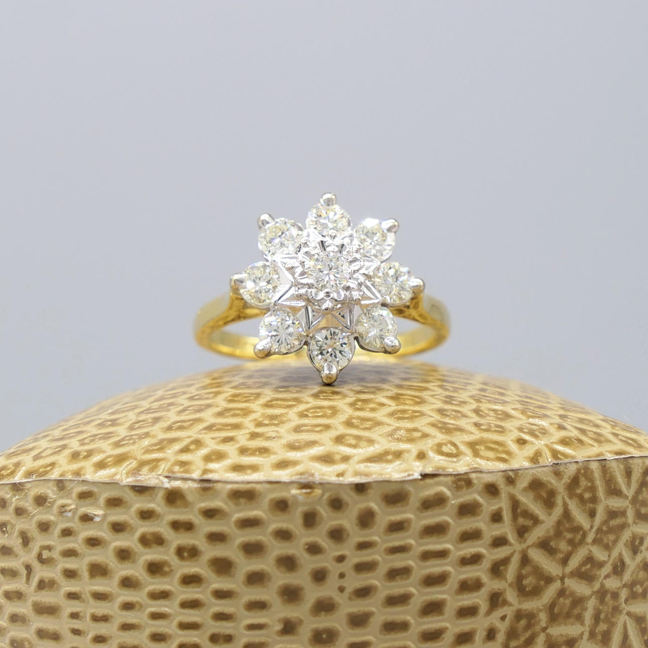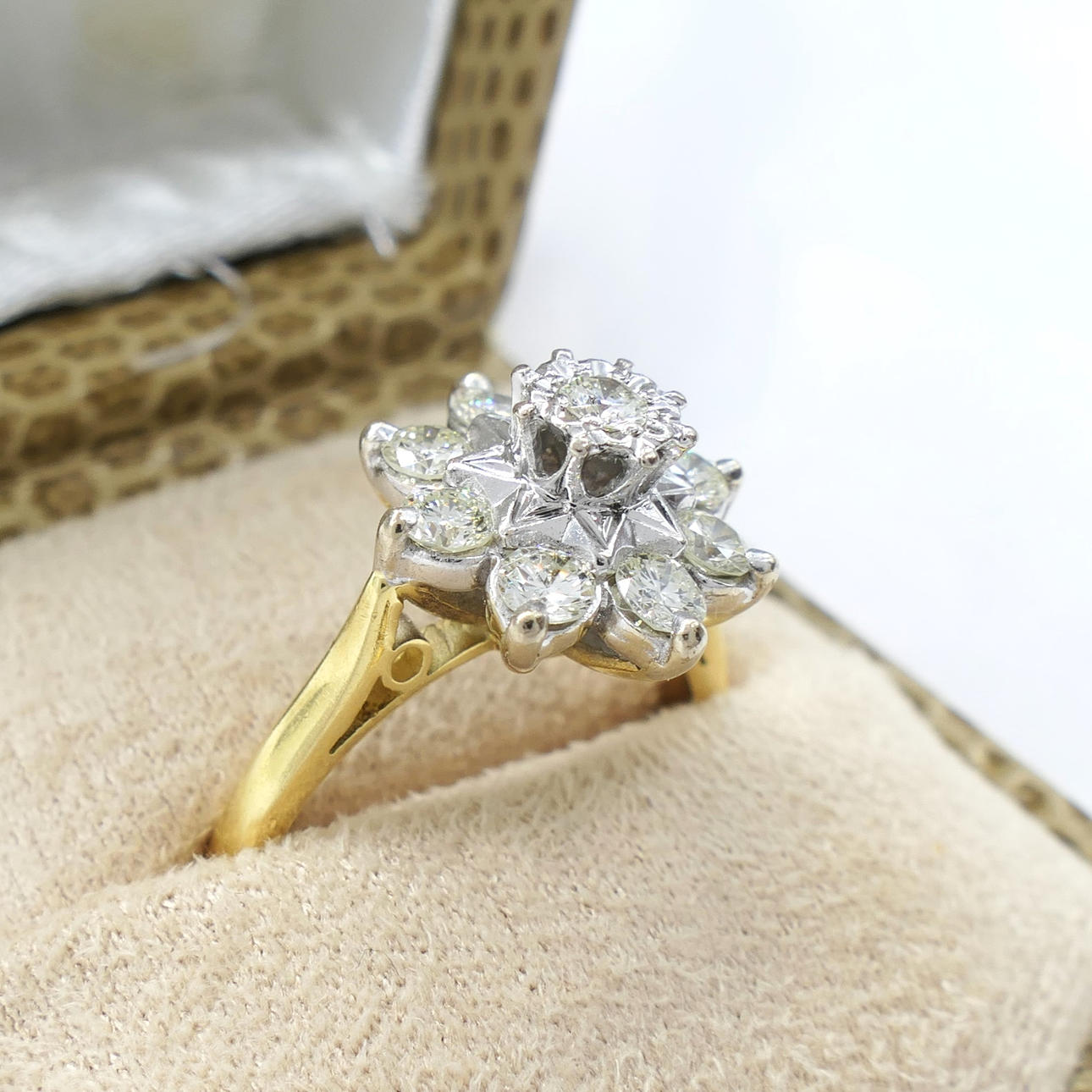 A vintage styled 18k yellow and white gold ring set with 0.60 carats approx of diamonds, with camel gift box