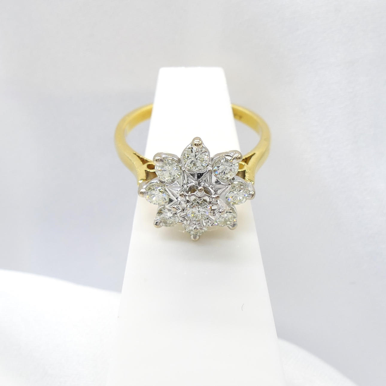 Diamonds: natural; 9 x round brilliant-cut; 0.60cts total, approx; H-I / good SI-I approx; claw and star-set