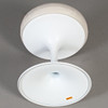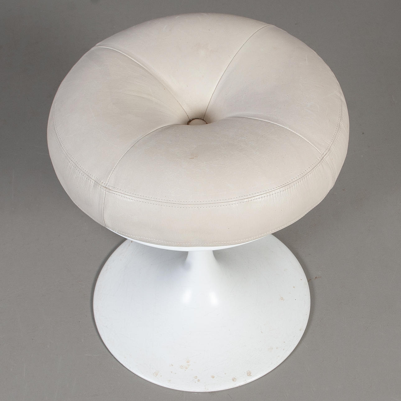Stool with round seat in light beige leather upholstery with button in the middle. Tulip shaped foot in white lacquered metal. Tagged under Johanson Design, Markaryd, Made in Sweden.