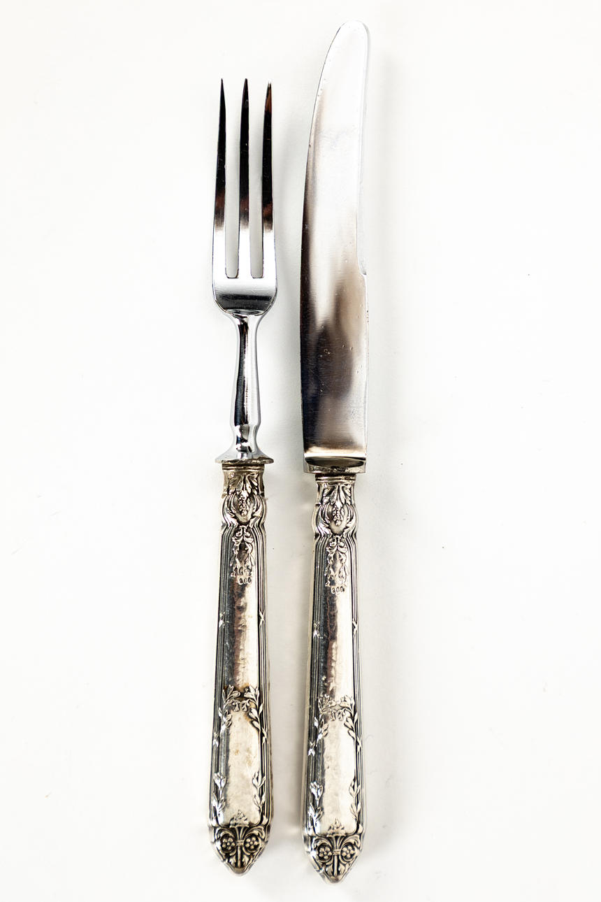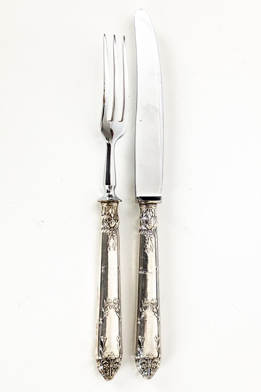 800 silver, filled/cast metal. Stuffed handles On the handles with fine plant relief in the style of Rococo. Silver stamp with crescent and crown (rubbed). 12-piece set, consisting of 6 forks (L: approx. 16 cm) and 6 knives (L: approx. 17 cm). Together ca. 216 g (with fillings and metal mounts).