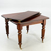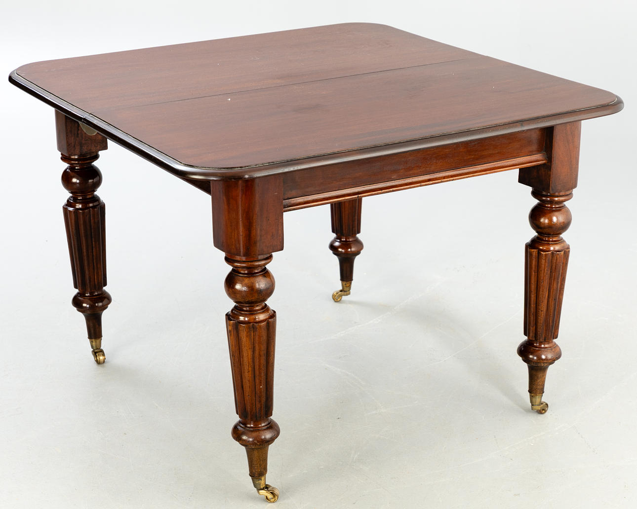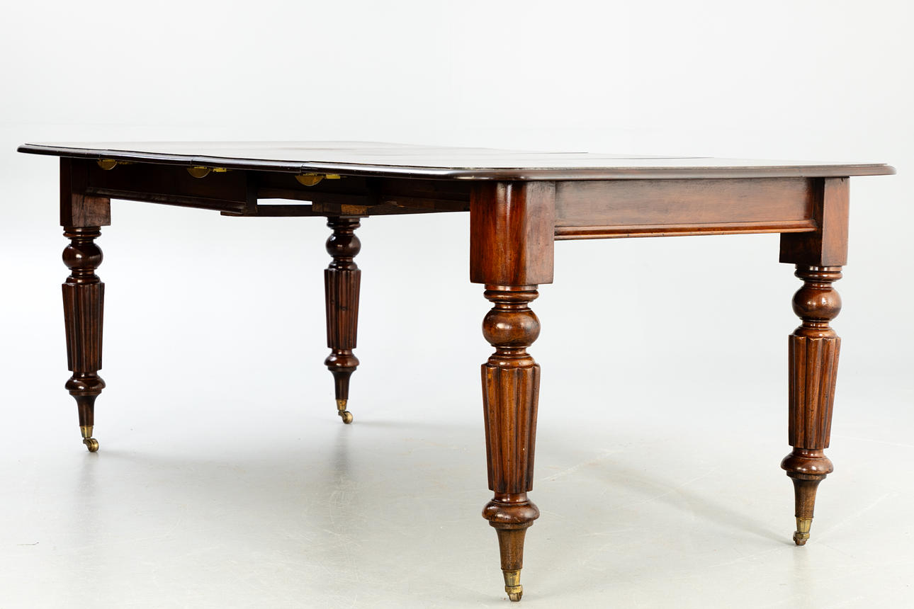 mahogany Articulated, fluted legs on rollers. Loose, overhanging table top with rounded corners. 2 insert plates, approx. 40 cm