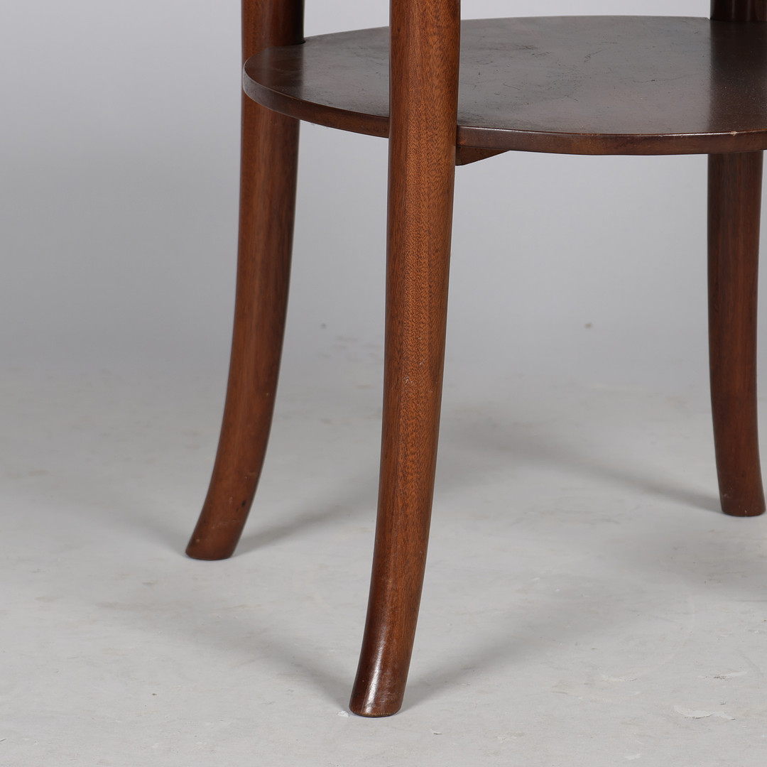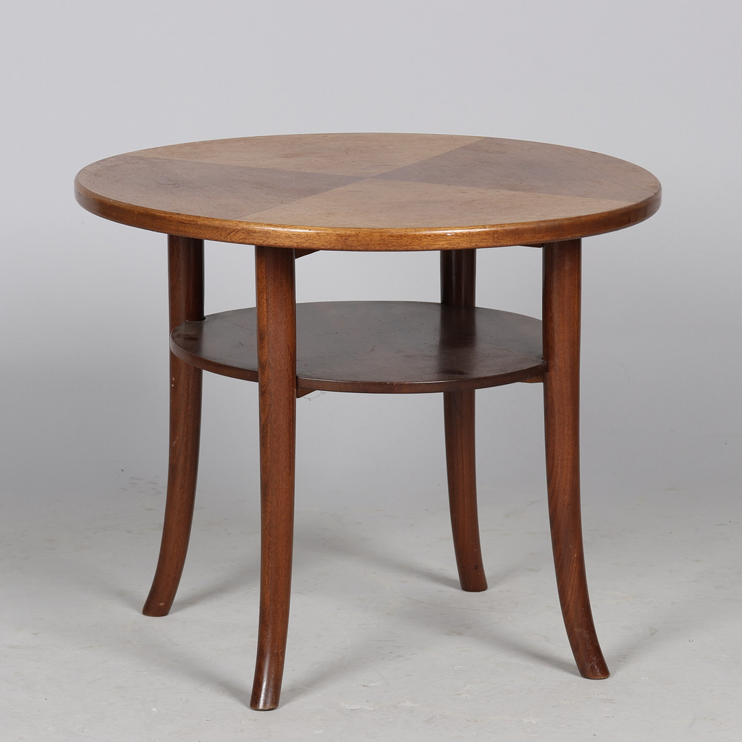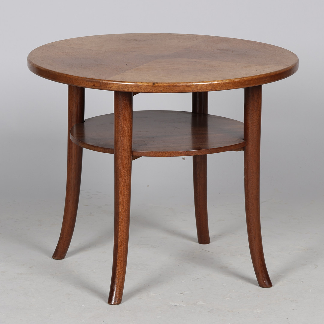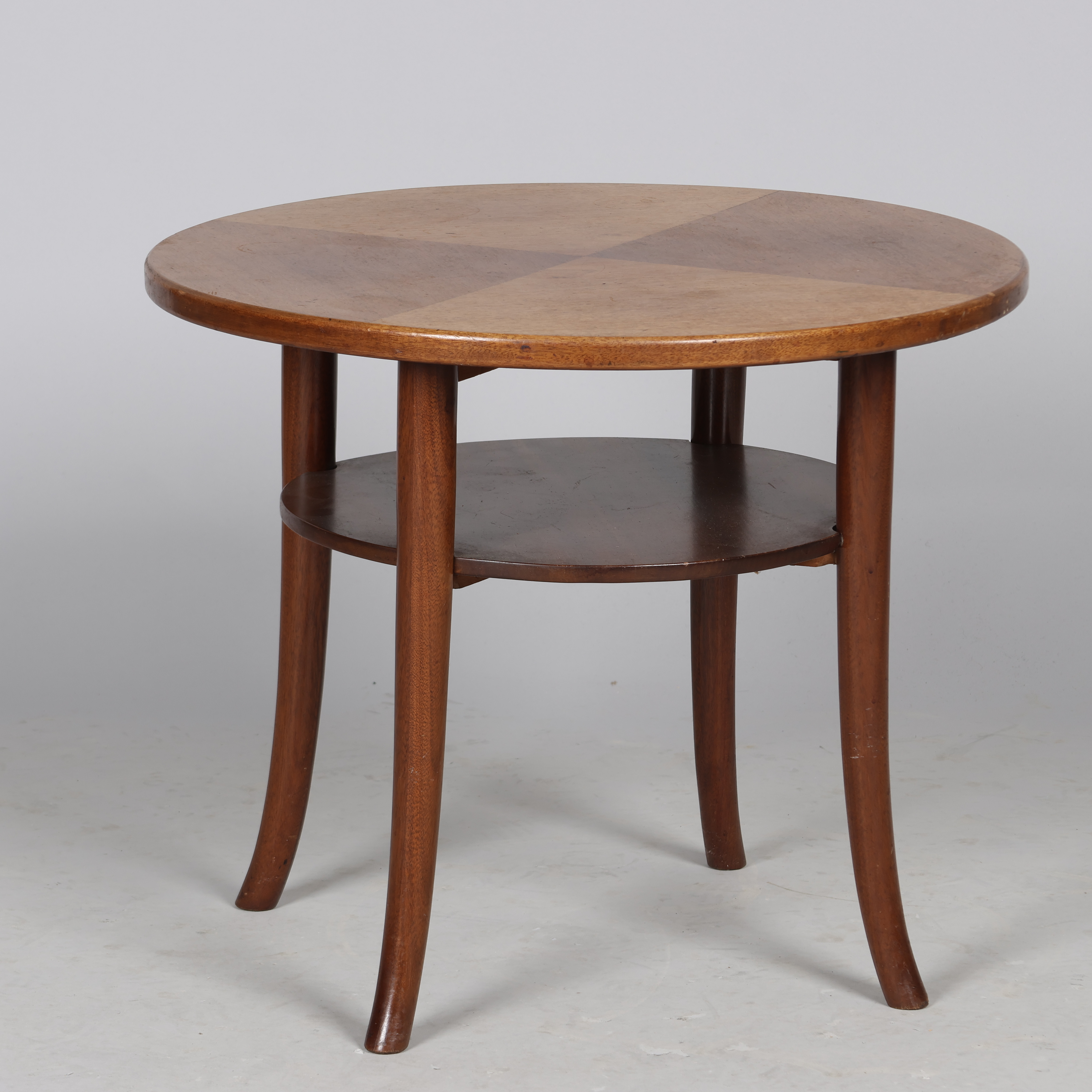 4428885. Danish master carpenter, round side table of veneered and solid mahogany with curved legs, Denmark, mid 20th century.