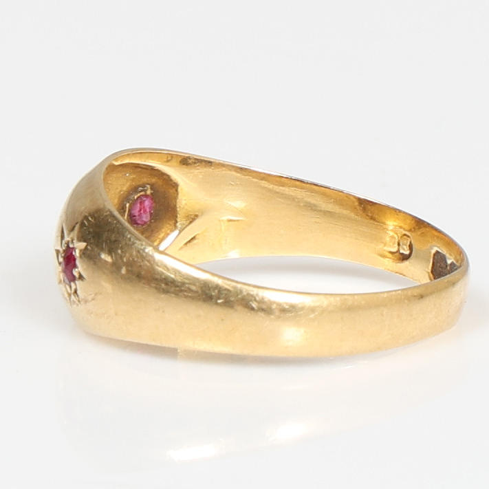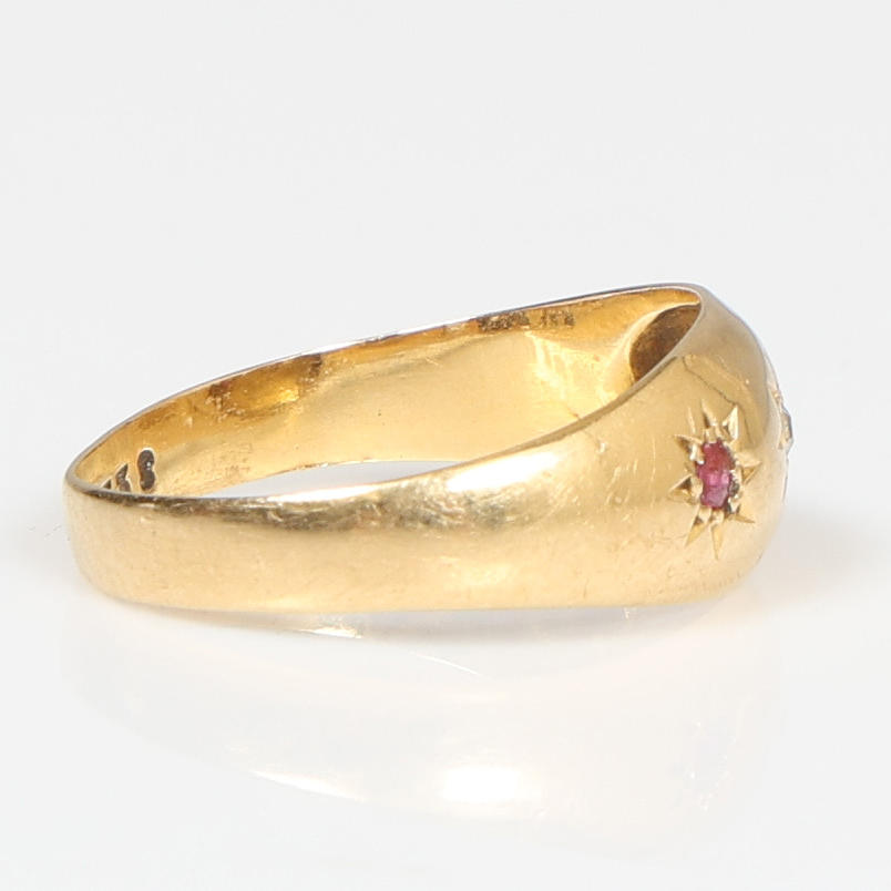 Inset with two rubies and a single diamond, ring size O, 2.5g.