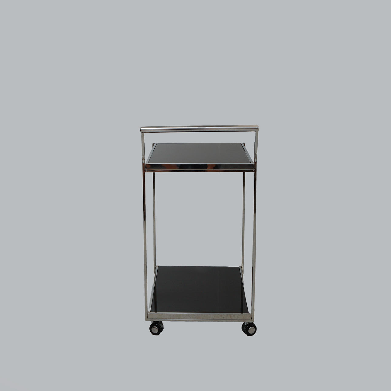 Chromed metal frame. Loose sheets of glass. On wheels.