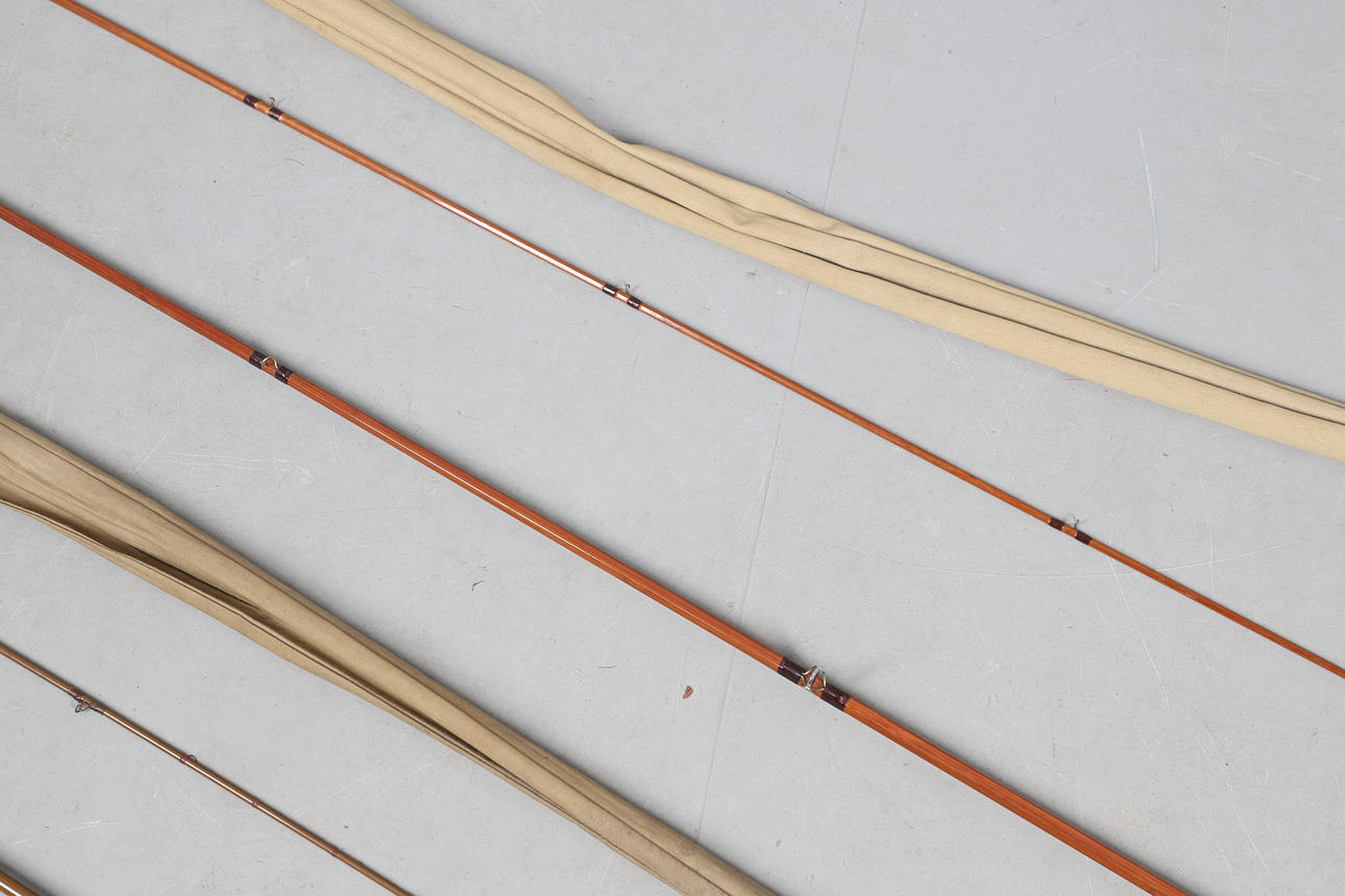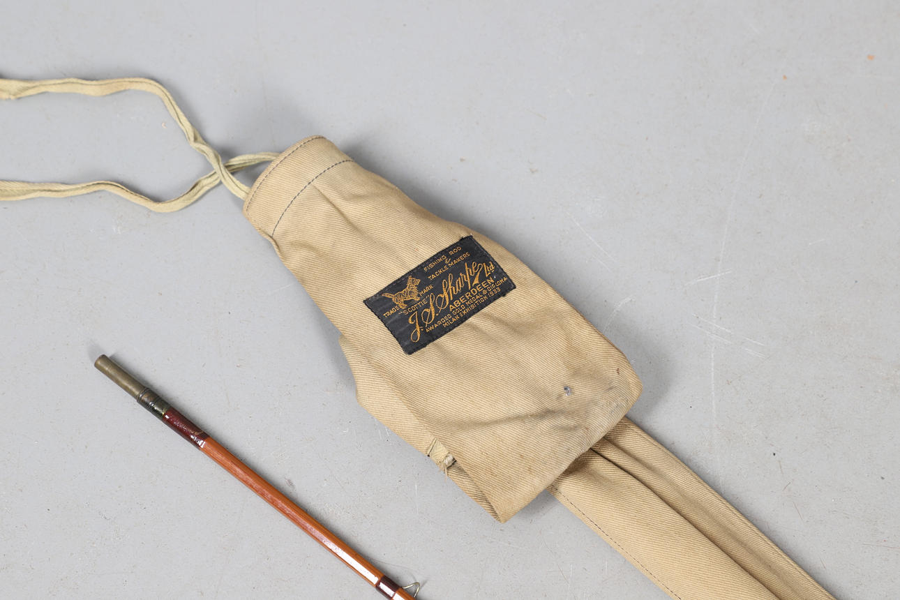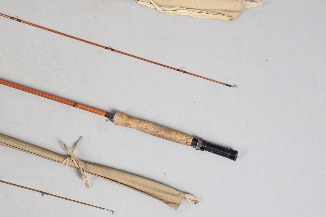 A Sharpes of Aberdeen 'Scottie' split cane two piece rod, 9ft 6' and in it's bag (bag 150cms high), also with an Apollo tubular steel trout rod, also in a bag (bag 112cms high). (2).