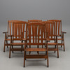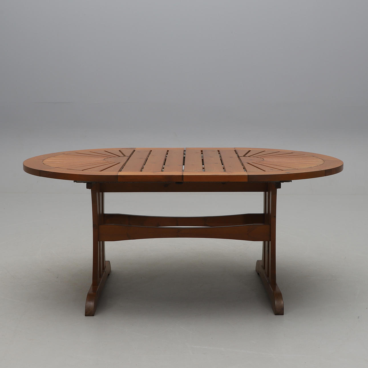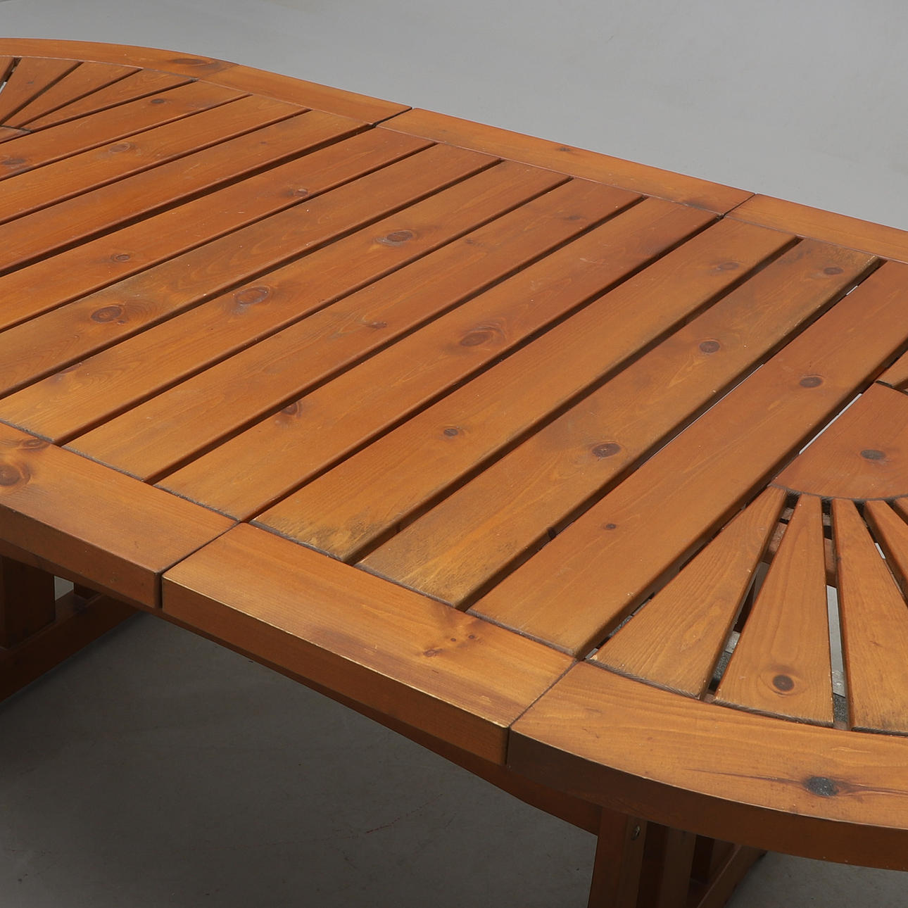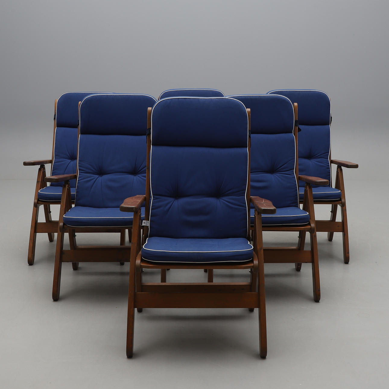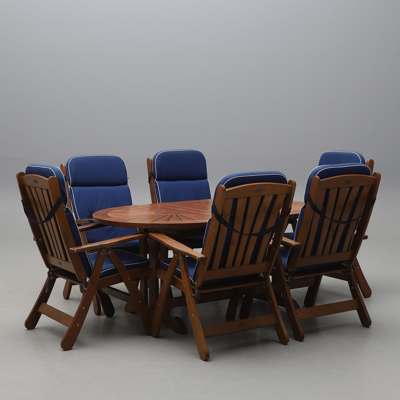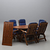 Stained pine. 6 folding armchairs with loose upholstered and textile upholstered cushions. Width 69, depth approx. 66, back height 105, seat height 44 cm. Dining table with a 50 cm insert. Length 170 (with insert plate 220), width 110, height 73 cm.