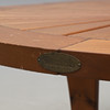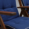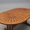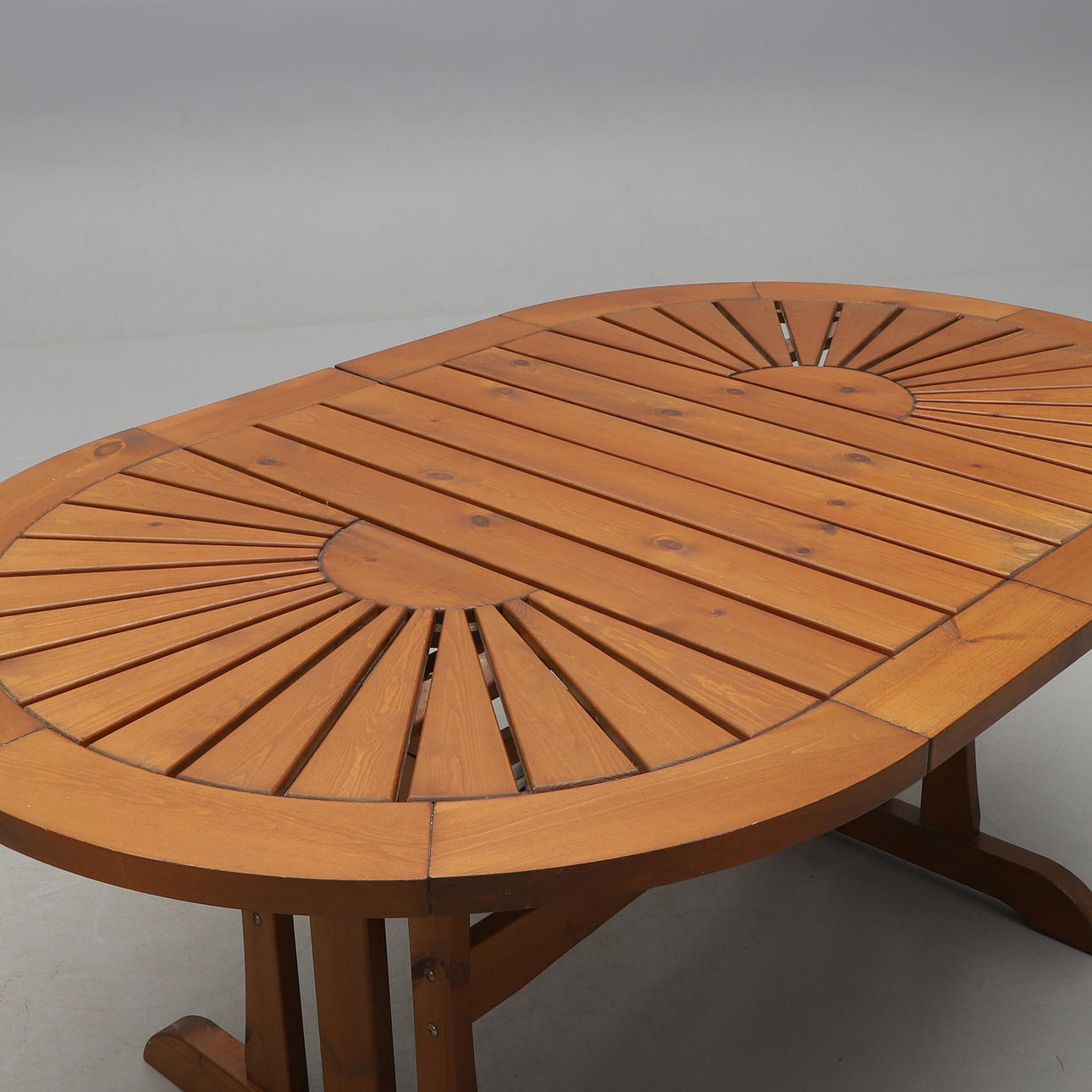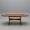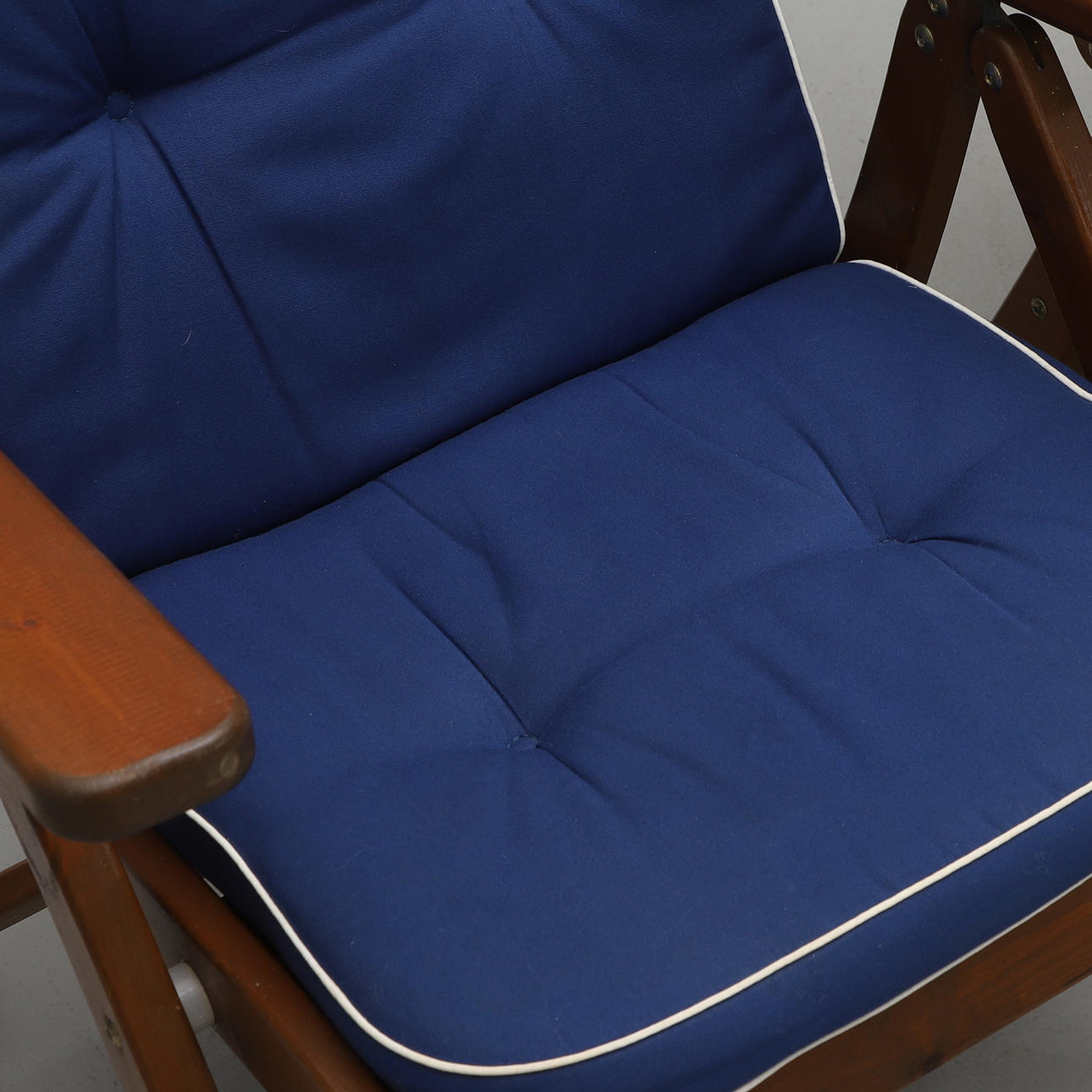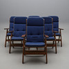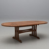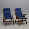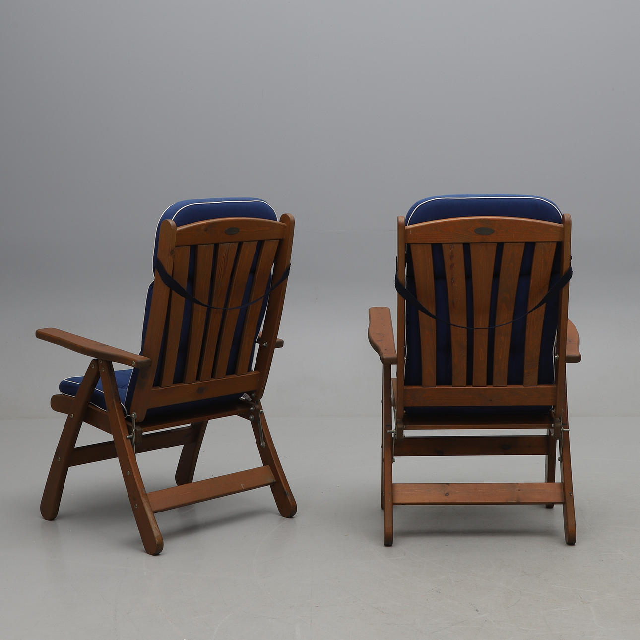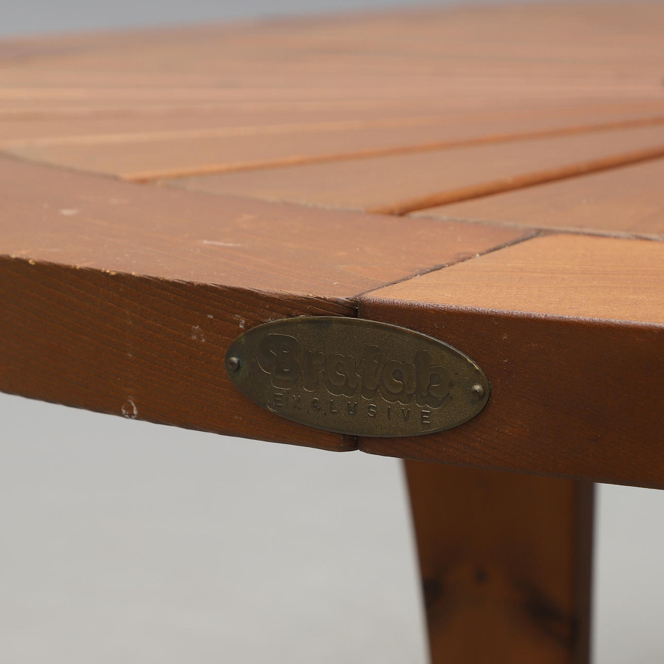 Stained pine. 6 folding armchairs with loose upholstered and textile upholstered cushions. Width 69, depth approx. 66, back height 105, seat height 44 cm. Dining table with a 50 cm insert. Length 170 (with insert plate 220), width 110, height 73 cm.