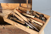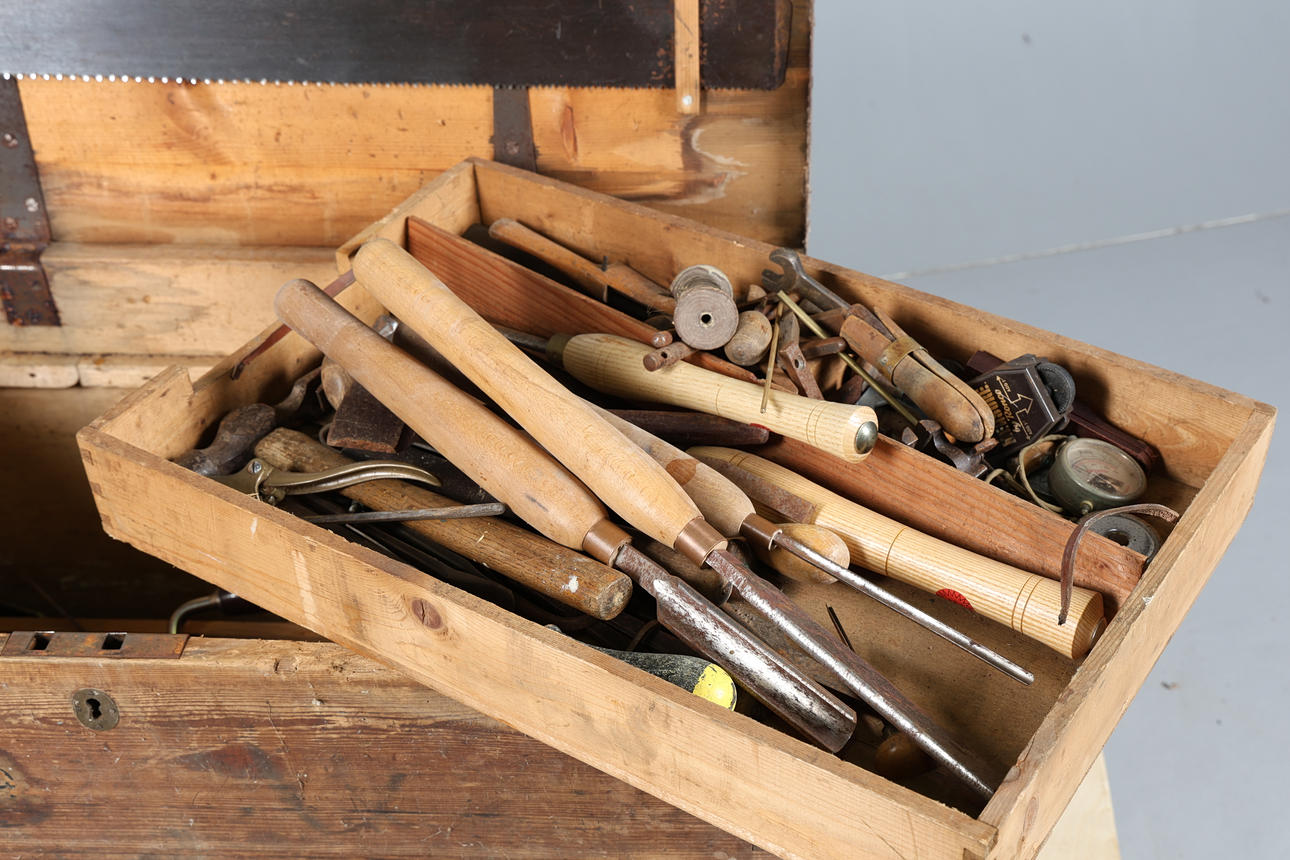 The contents to include a Rapier Plough Plane, hand saws, woodturning tools, a bit brace etc., the chest 81.5cm wide, 53cm high, 47cm deep.