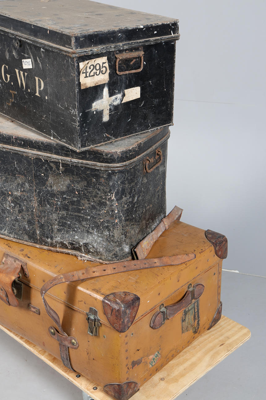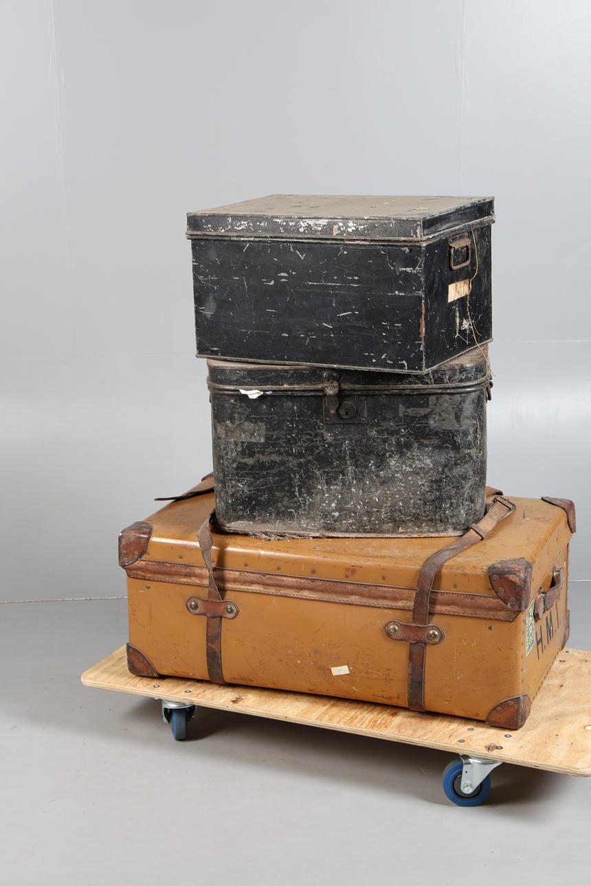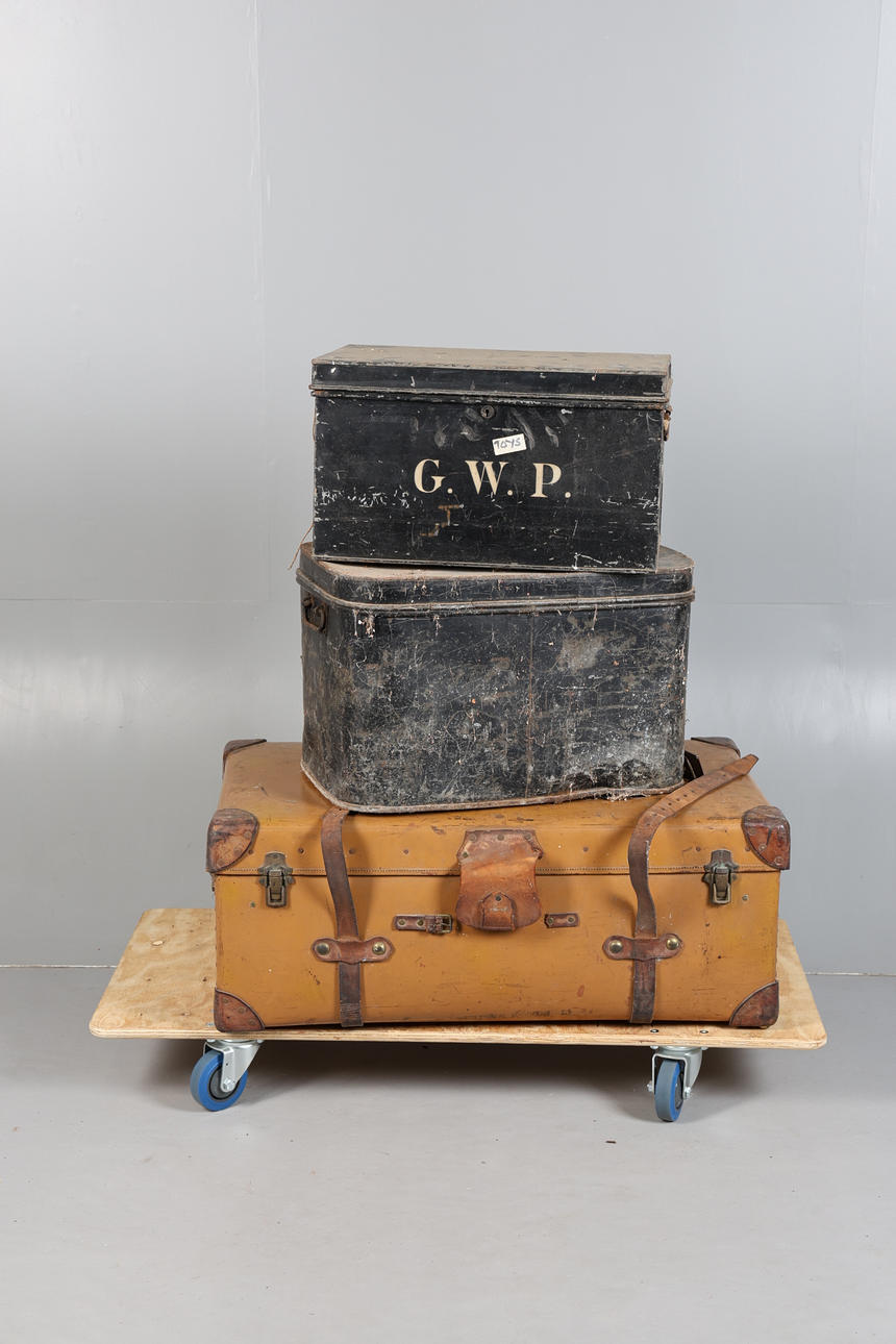 The leather suitcase 92cm wide, 55cm deep, 36cm high, and two black painted storage boxes, 56cm and 62cm wide (3).