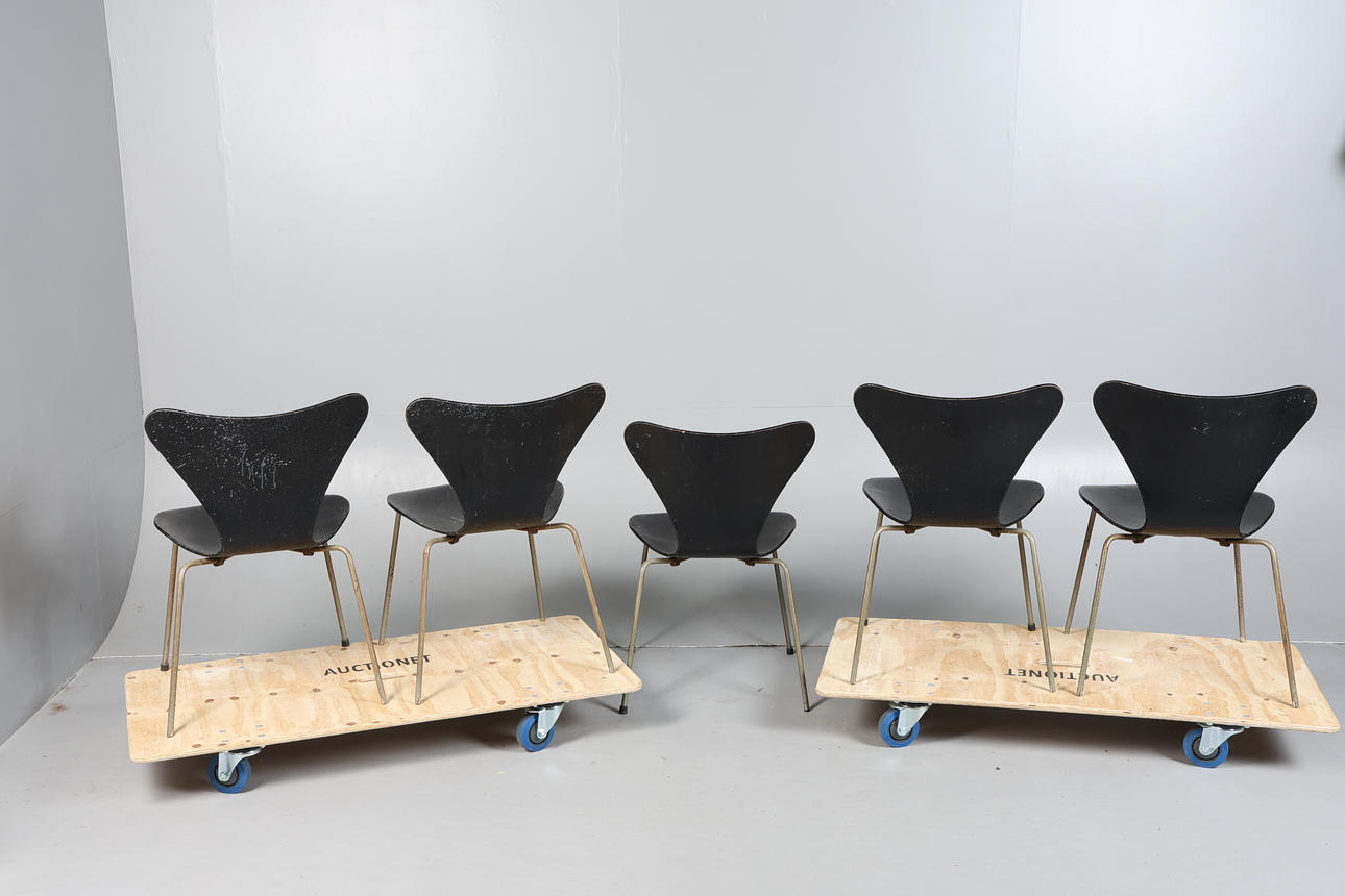 Five tubular metal and blackened plywood chairs in the style of Arne Jacobsen's Series 7 3107 chair as seen in the iconic image of Christine Keeler by Leis Morley, each measuring 76cm height, 46cm width, 54cm depth. (5).