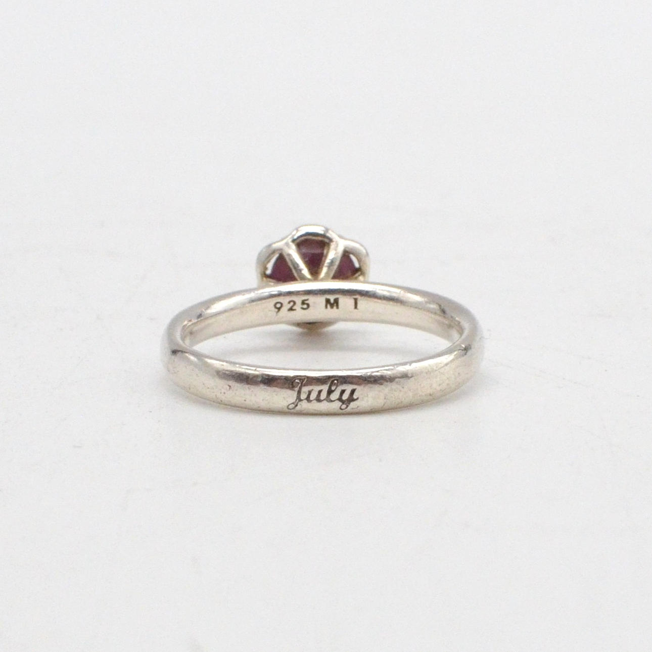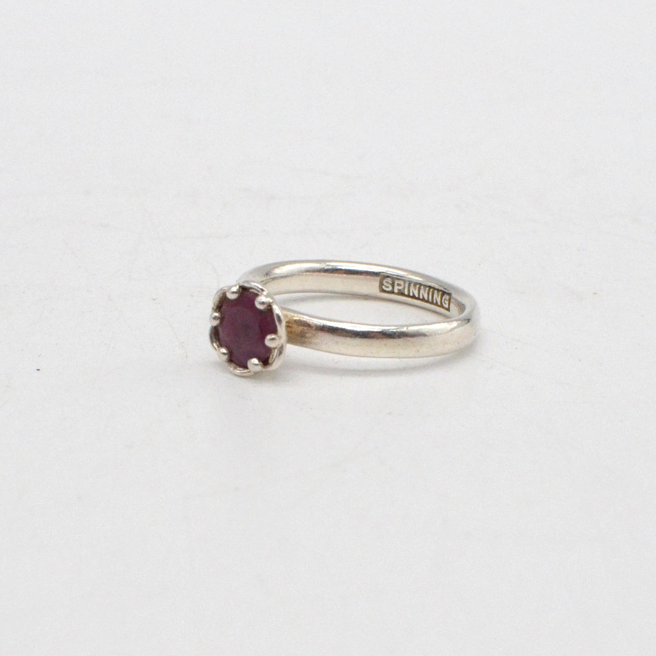 With an openwork sterling silver setting set with a round-cut ruby. Stamped on the inside: 925 M. SPINNING. Engraved on the outside: July.