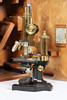 A brass and metal monocular microscope by Leitz Wetzlar, in a fitted mahogany case and with a variety of lenses and accessories. Case 38cms high, top 19cms by 18cms.