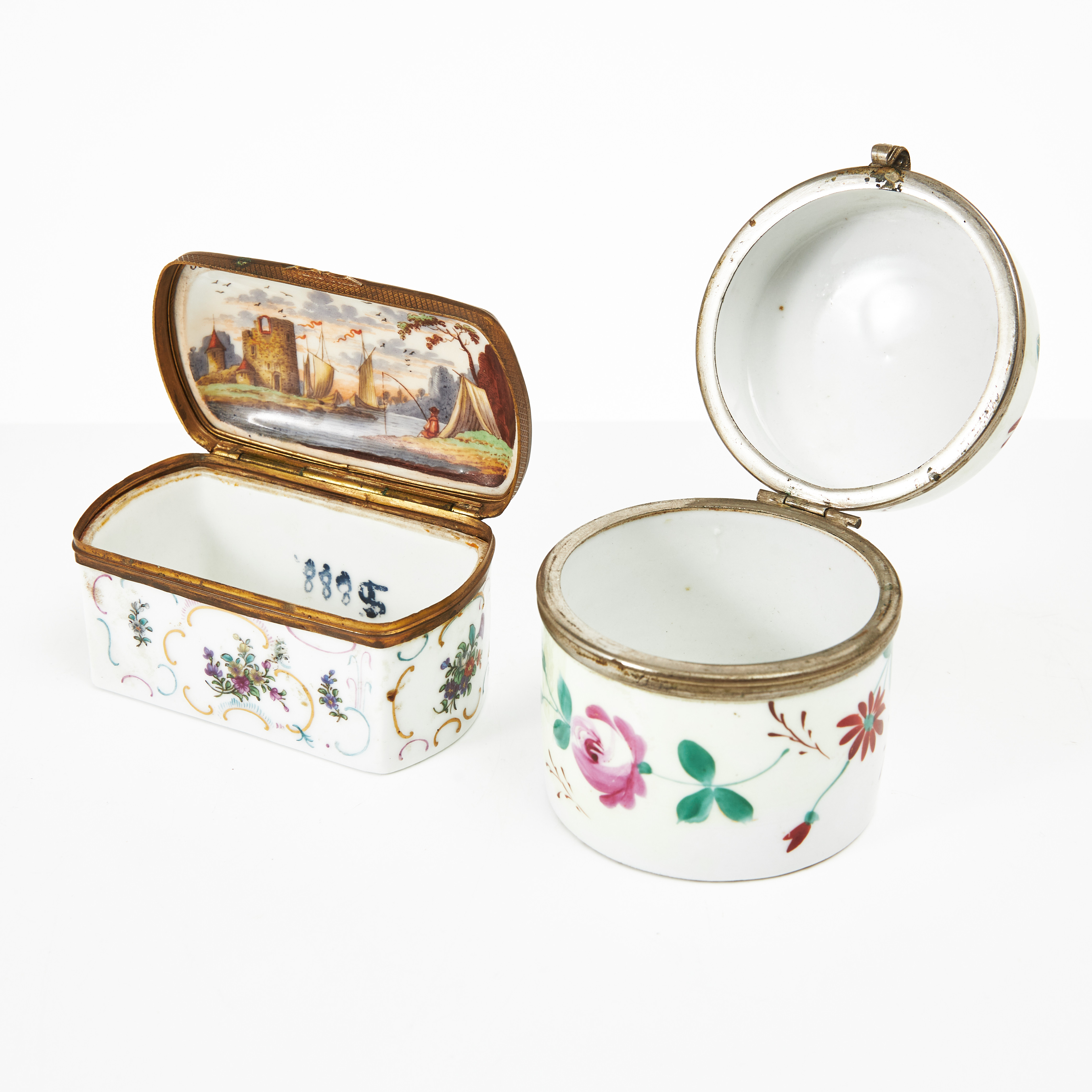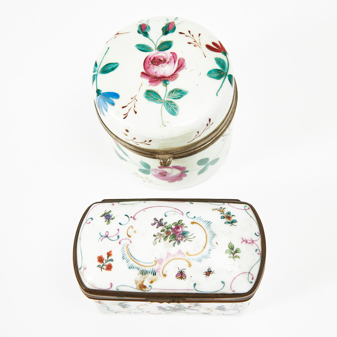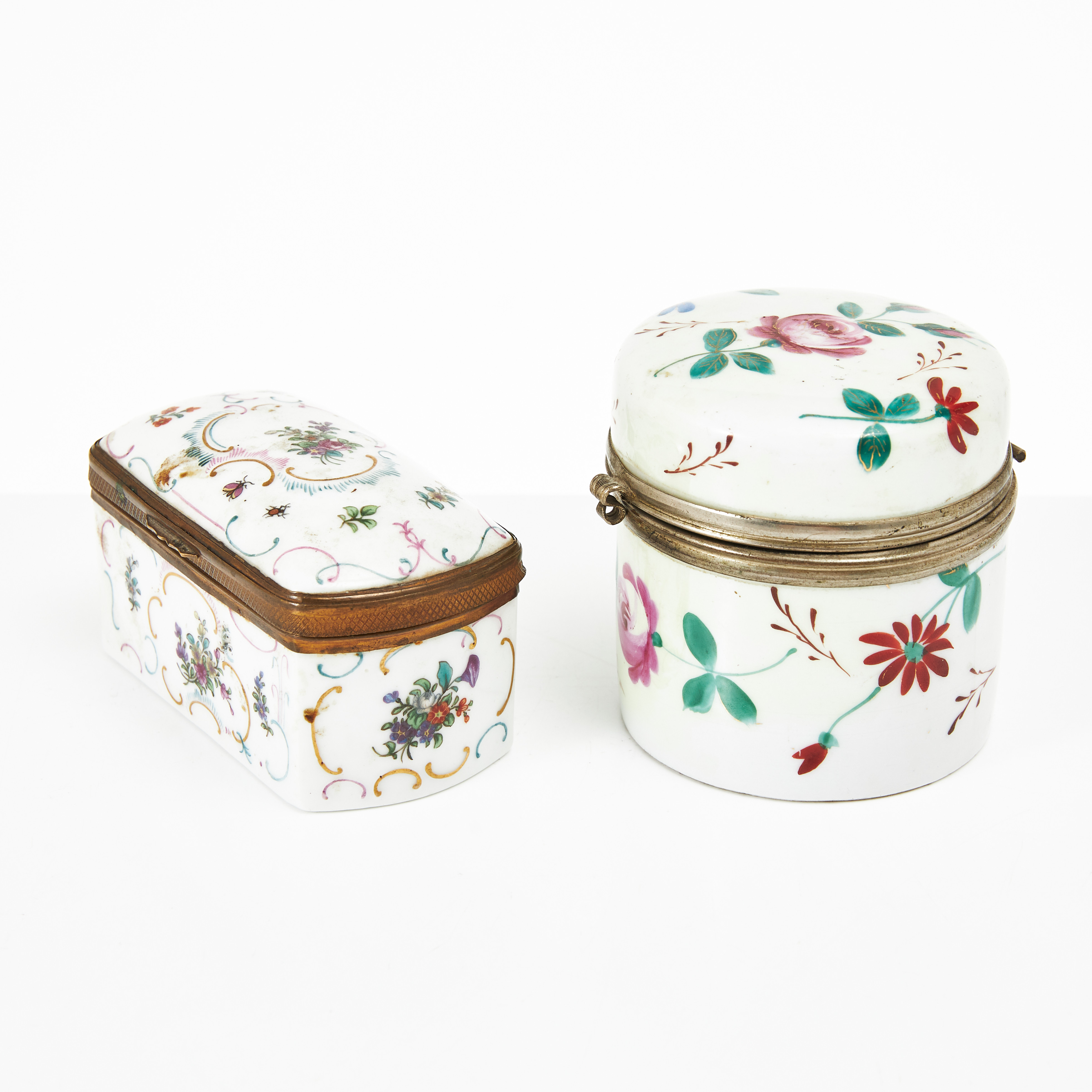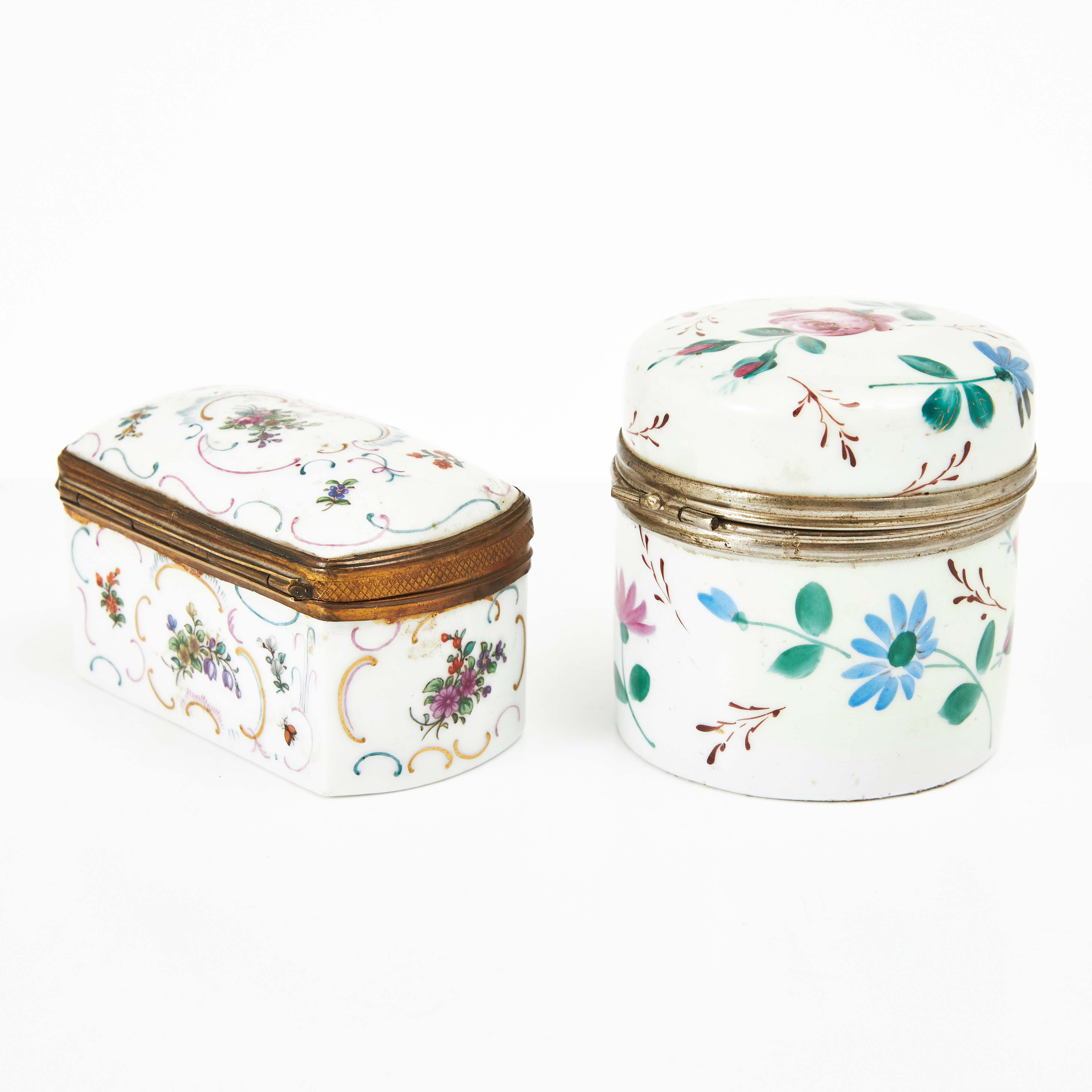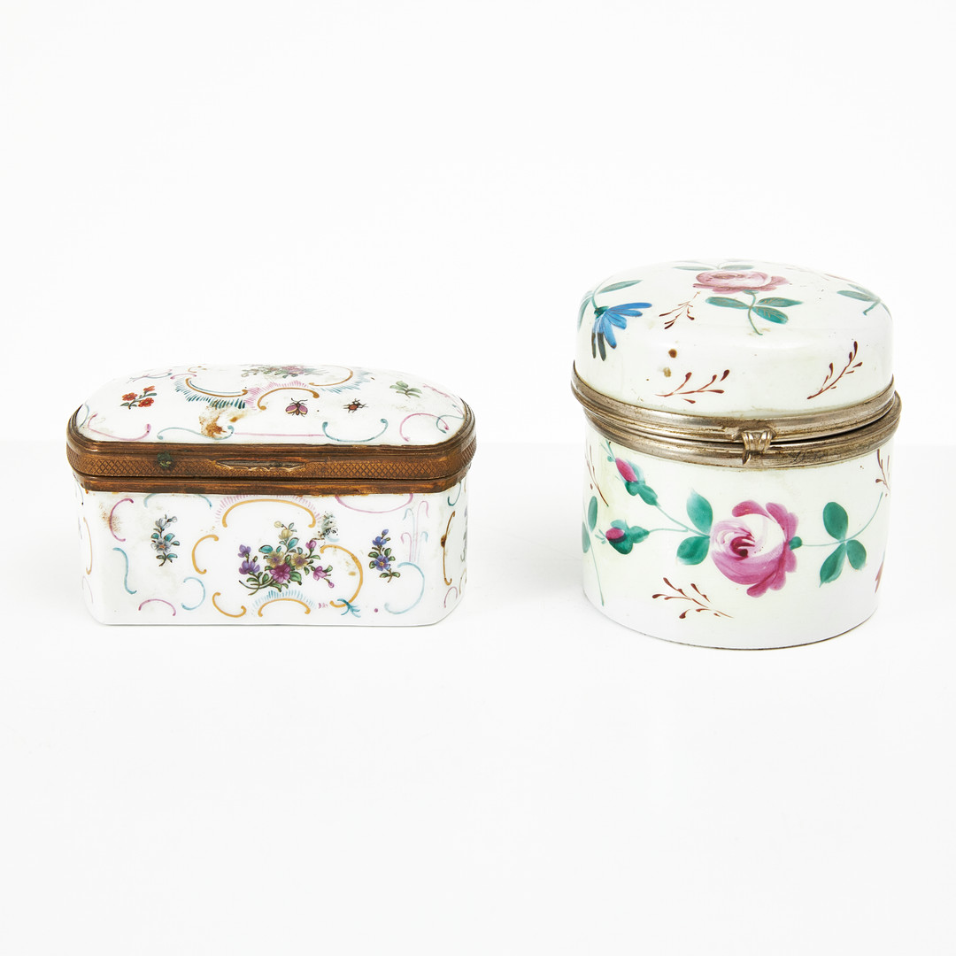 4431806. A set of 2 porcelain boxes, 19th century, decorated with flowers, rectangular or round shape.