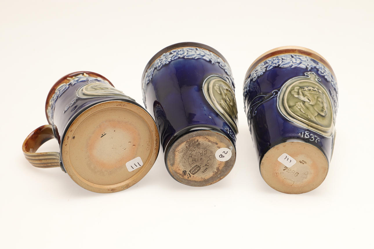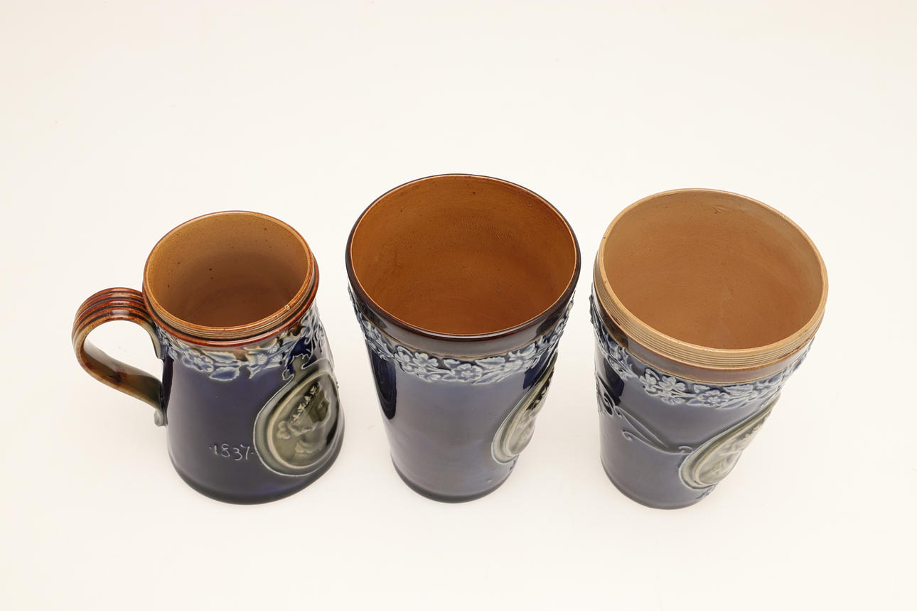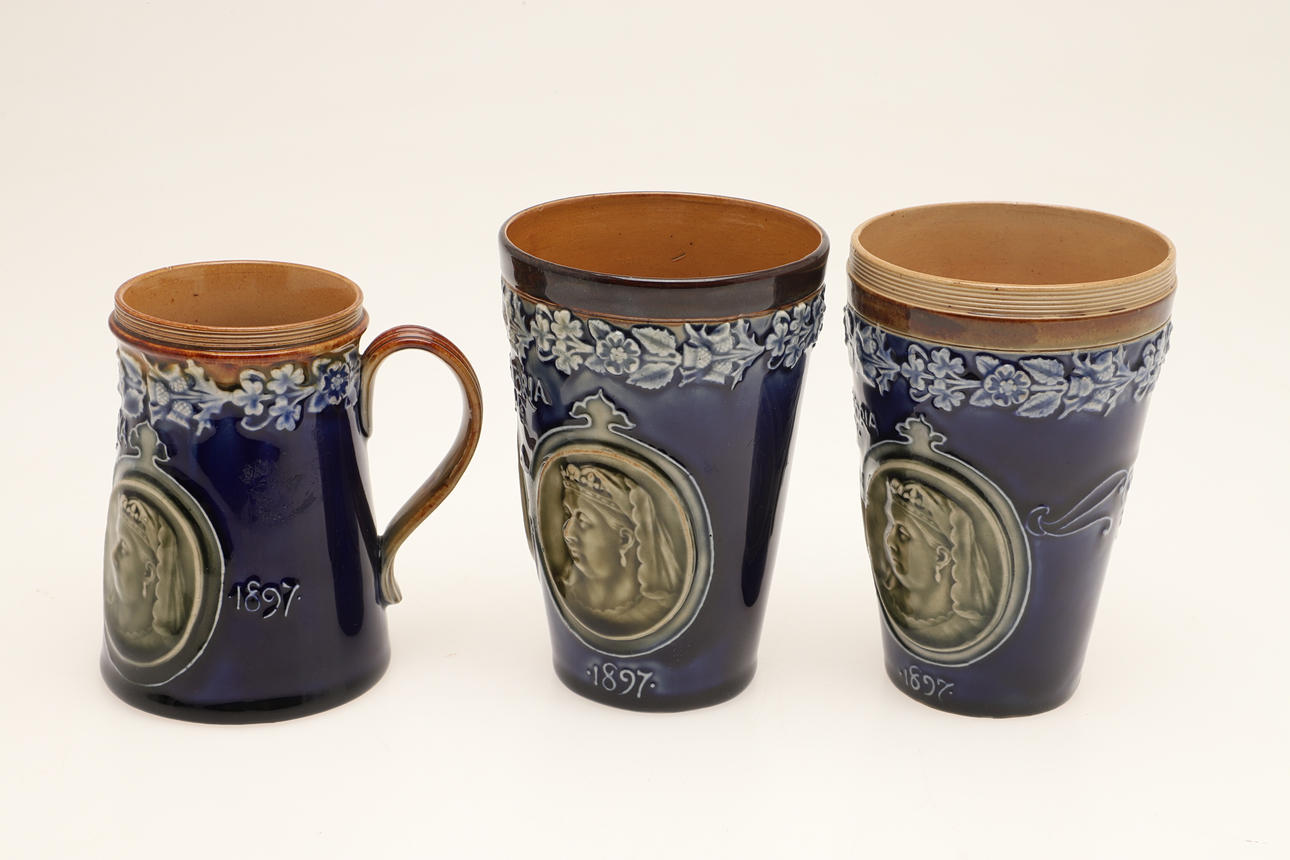Three Queen Victoria Doulton Lambeth items, including two beakers (13cms and 12.5cms high) and a jug (11cms high), all made for the Diamond Jubilee in 1897. (3).