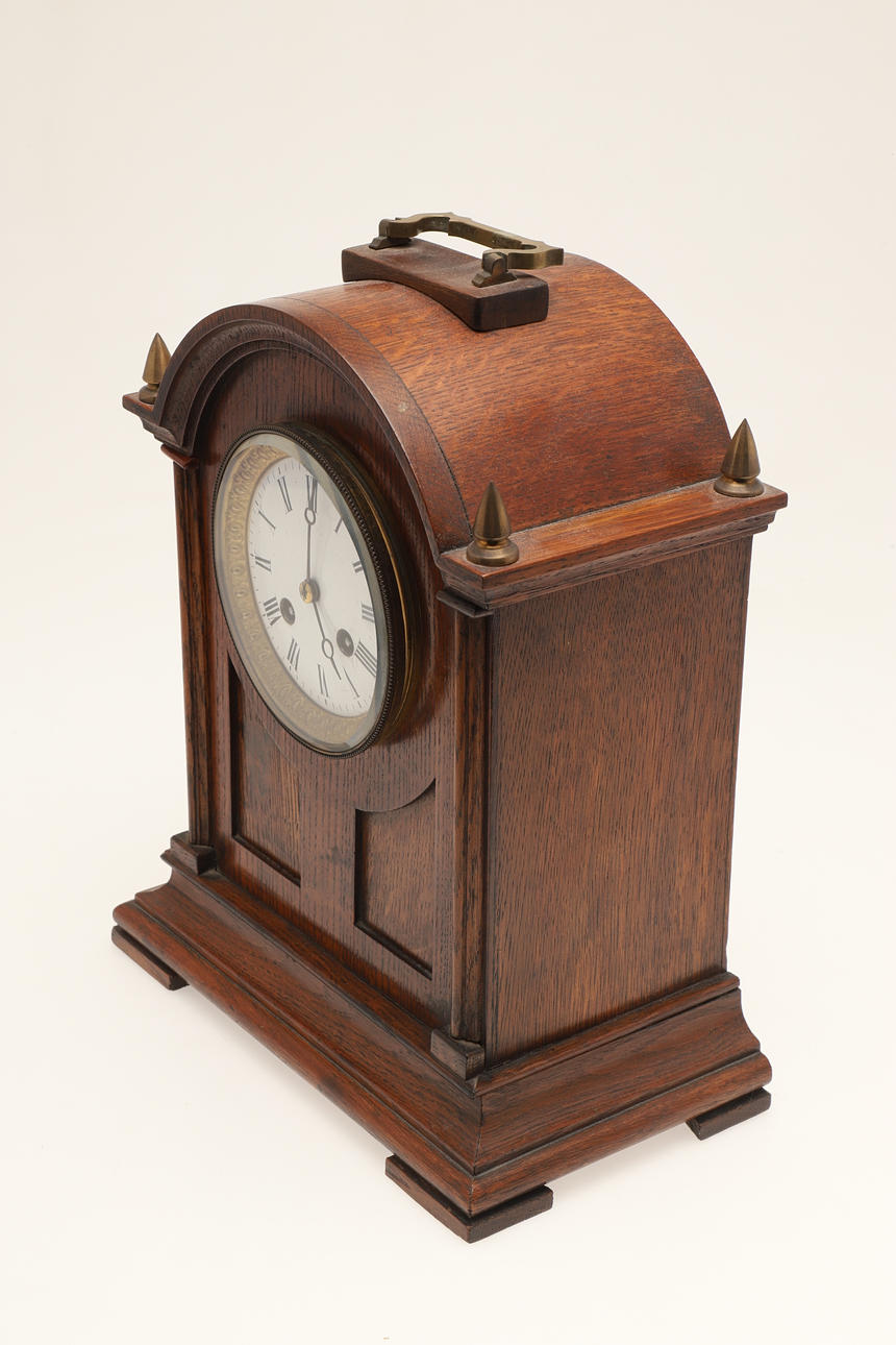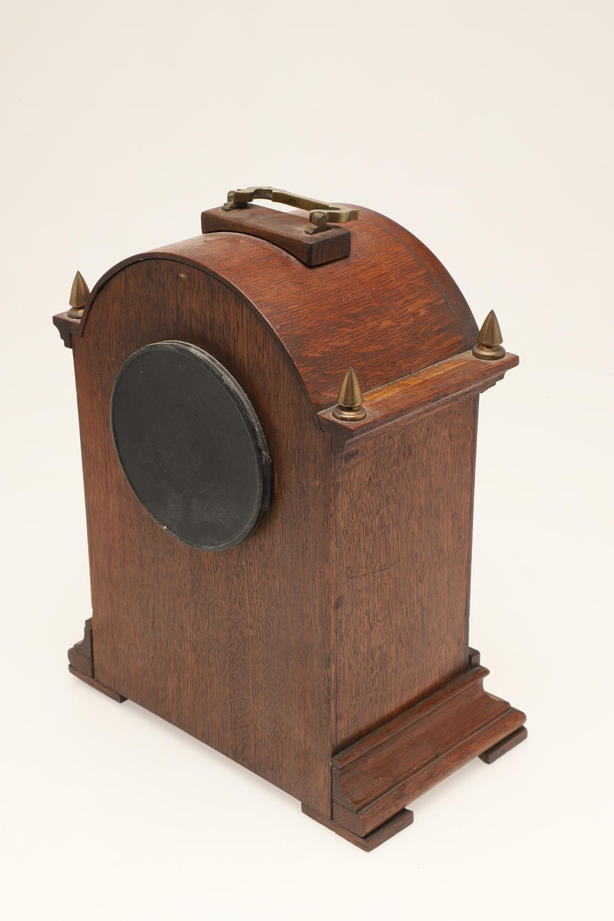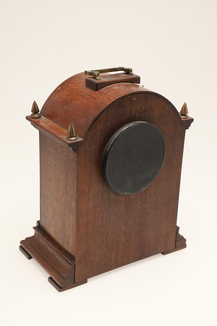 An oak cased mantle clock with an arched top and brass finials, with an enamel dial and black numerals, and striking on a bell. With a pendulum, case 30cms high.