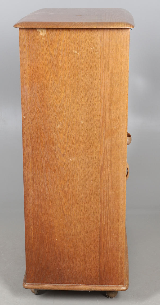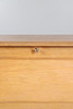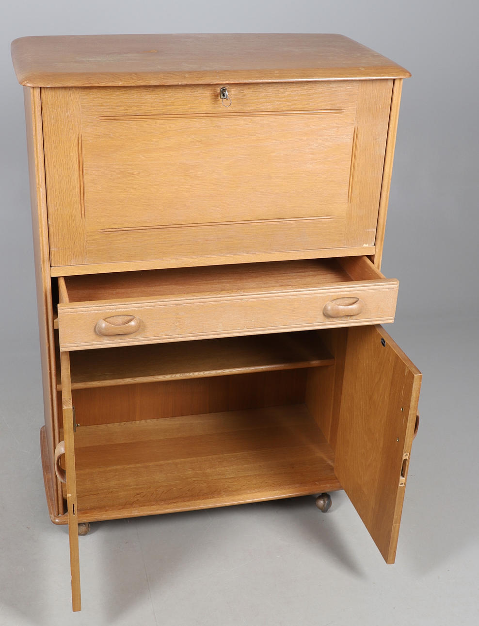 A mid century light elm bureau, with a drop down flap and a fitted interior, with a single drawer and cupboard to the lower section. 114cms high, top 80cms by 45cms.