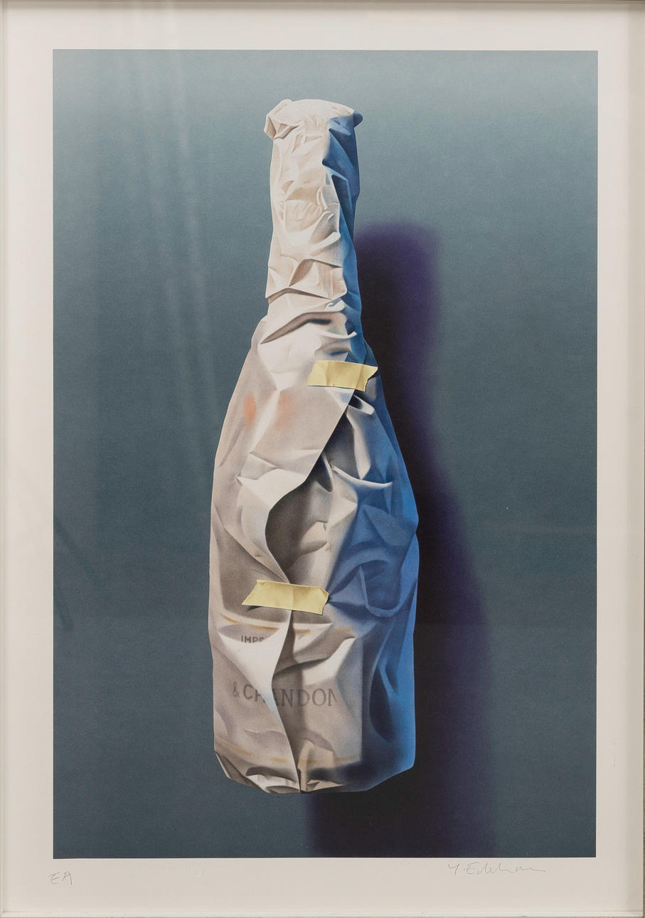 YRJÖ EDELMANN. Wrapped Moët & Chandon bottle, colour lithograph, signed, EA edition.