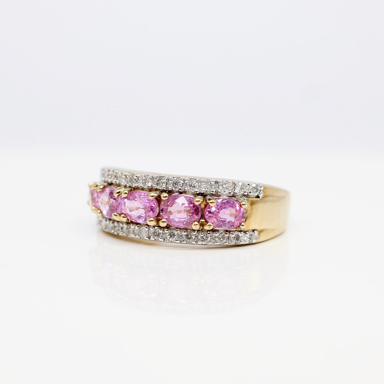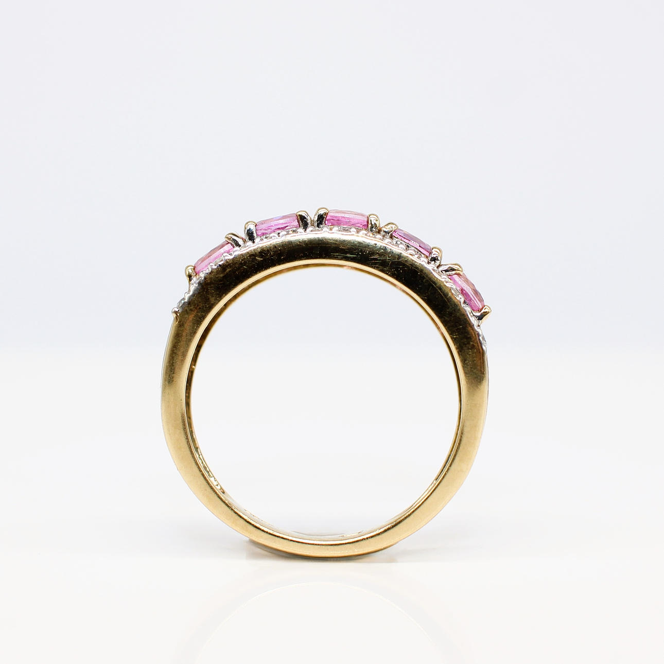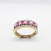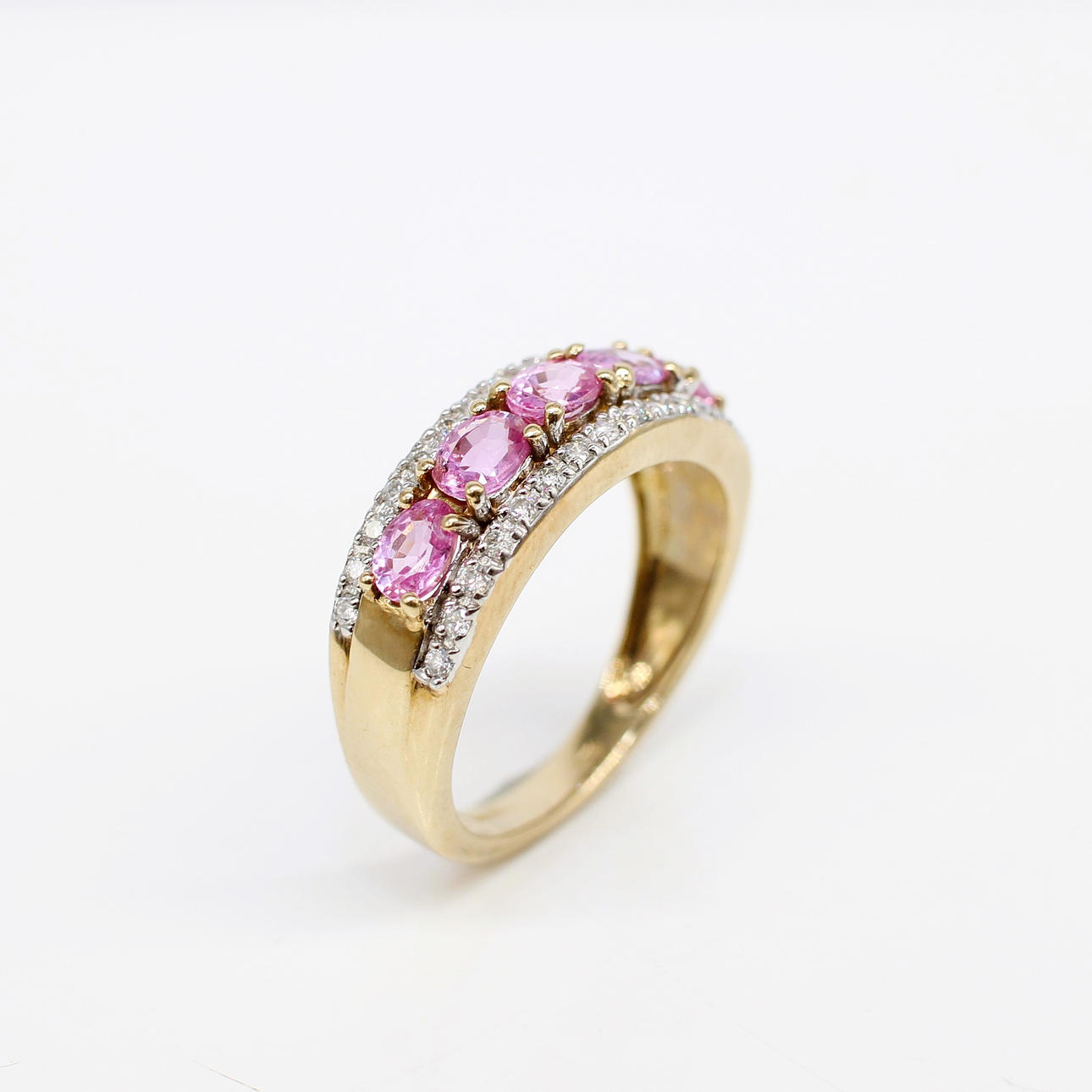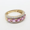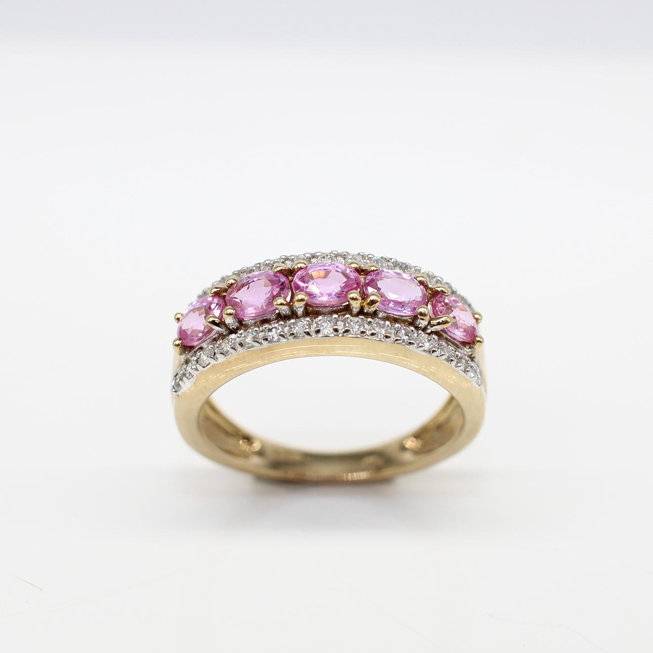 A 9ct Yellow Gold Band Set With 5 X Oval Cut Pink Sapphires And Round Brilliant Cut Diamonds.