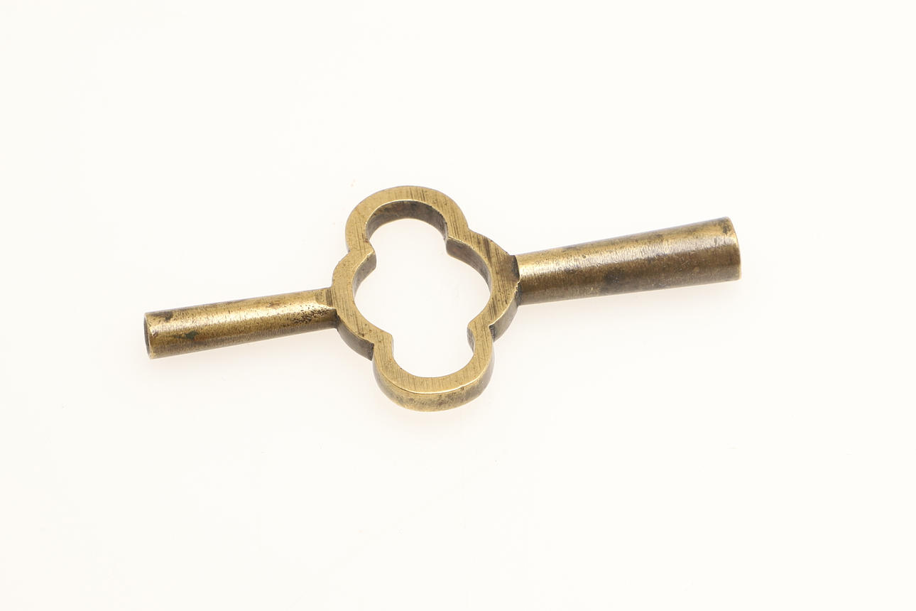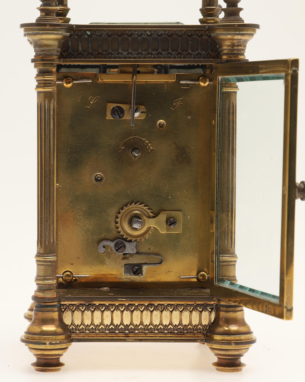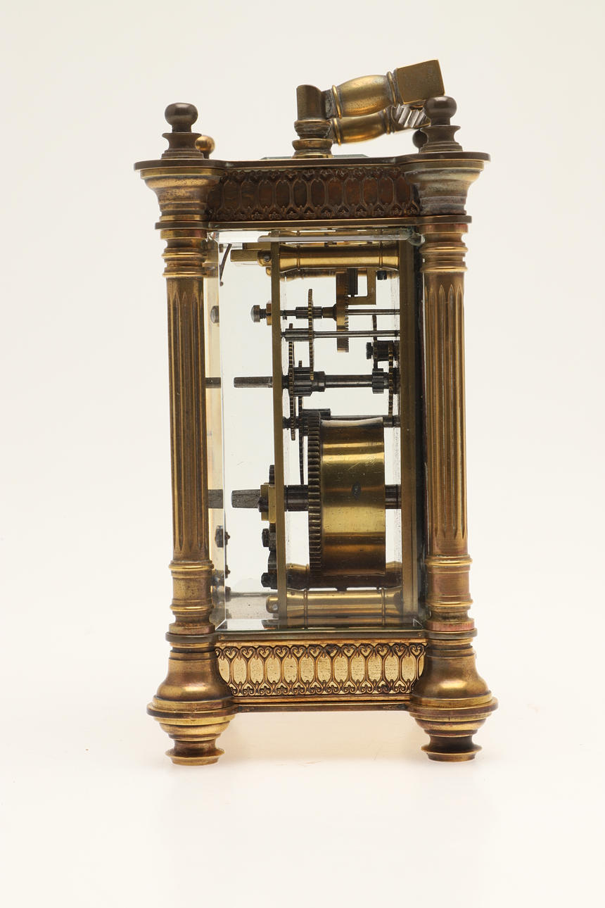 The brass case with fluted columns and filigree borders, with an enamel dial and carrying handle. 16cms high to the top of the handle.