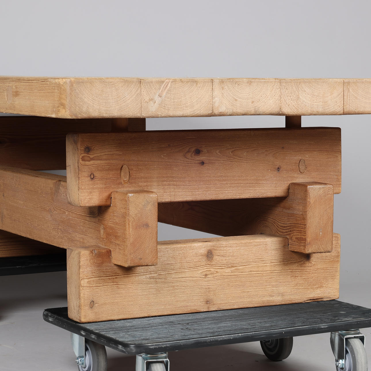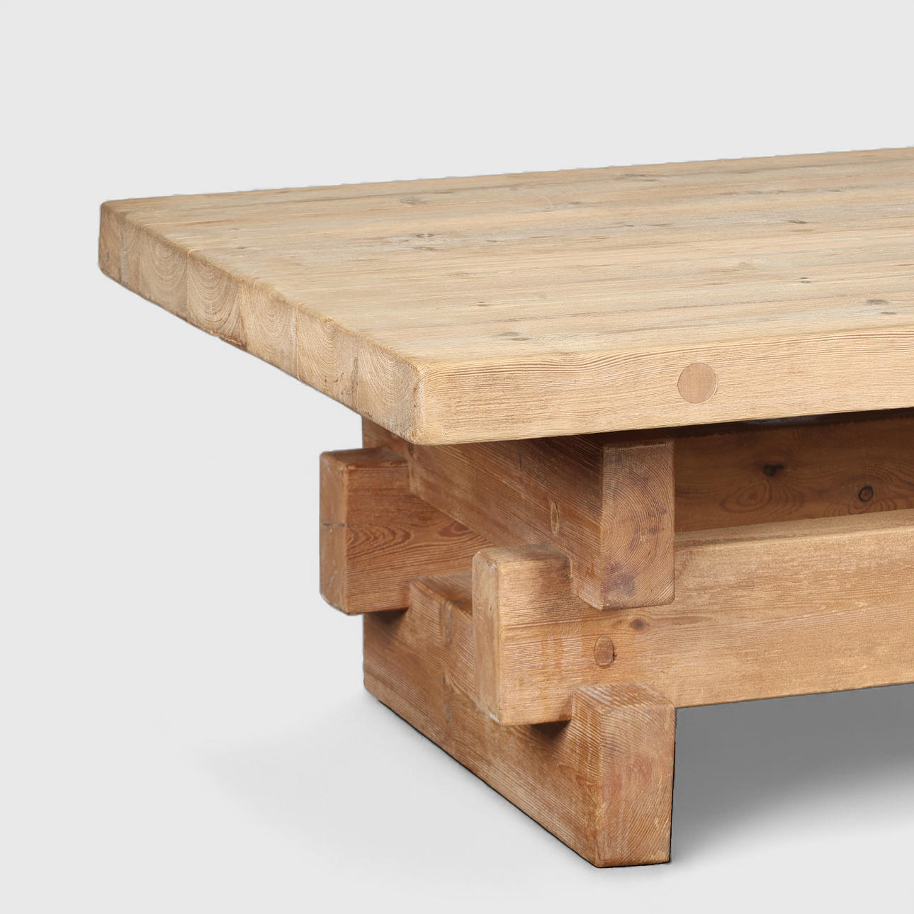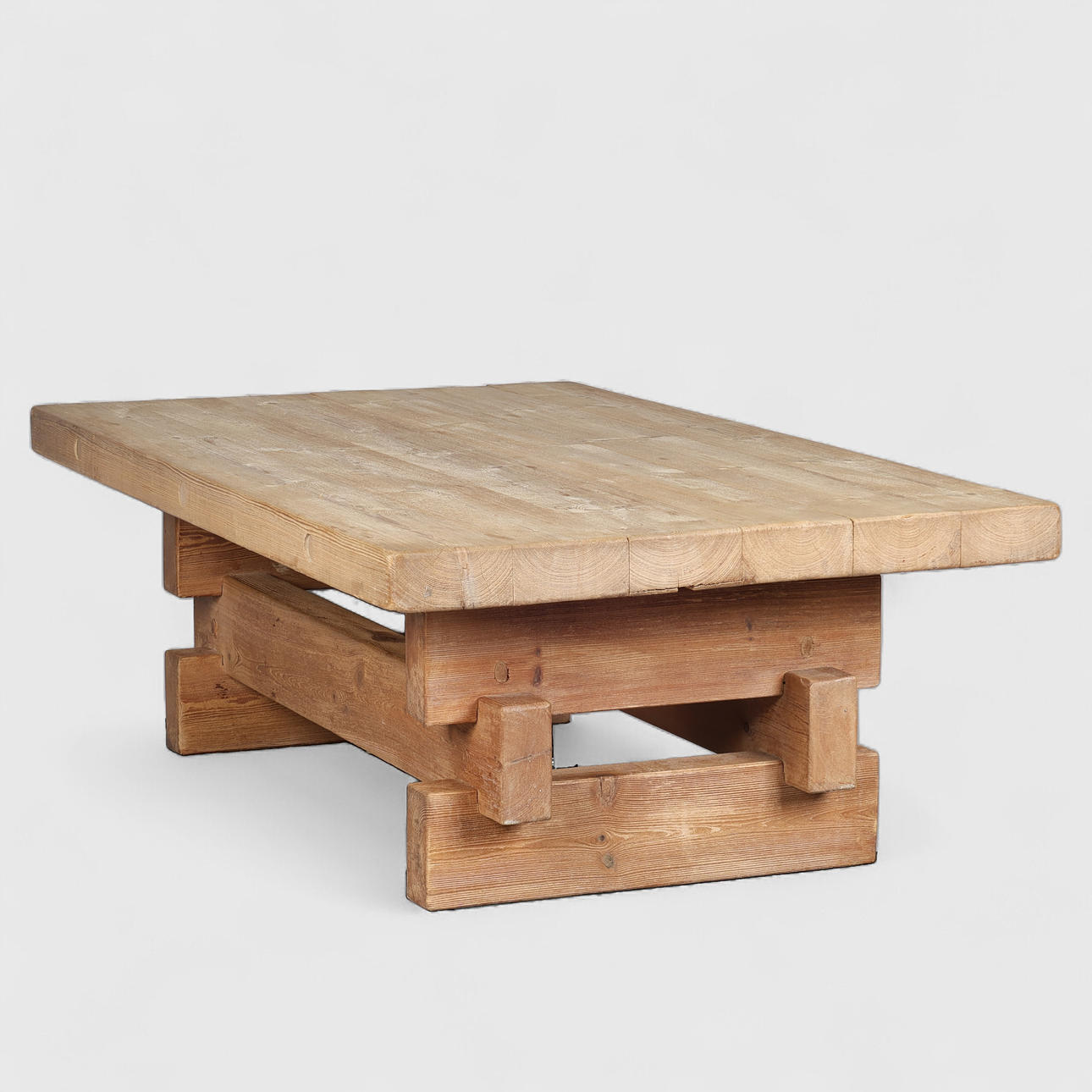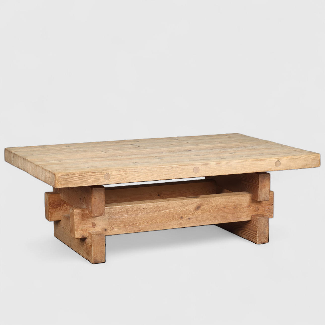 Jens Lyngsøe. Rectangular coffee table made of solid Pomeranian pine, H.48 x 140 x 86 cm. Negotiated by Anton Dam in Copenhagen in the 1980s and made from demolition lumber from old buildings, such as the blue and yellow warehouse at Toldboden in Copenhagen that dates back to the 18th century.