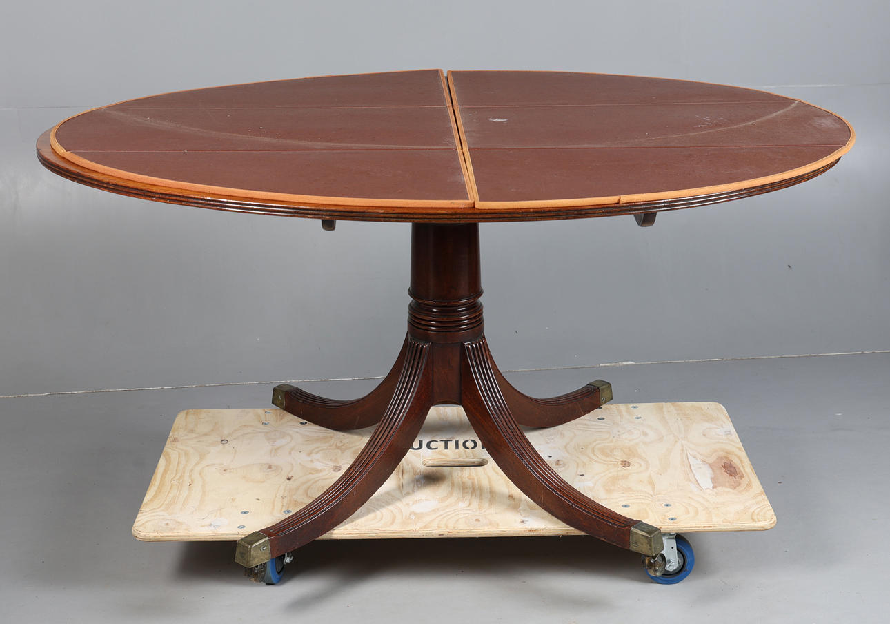 The oval tilt top raised on four splayed legs and castors, 148cm wide, 105cm deep, 75cm high.