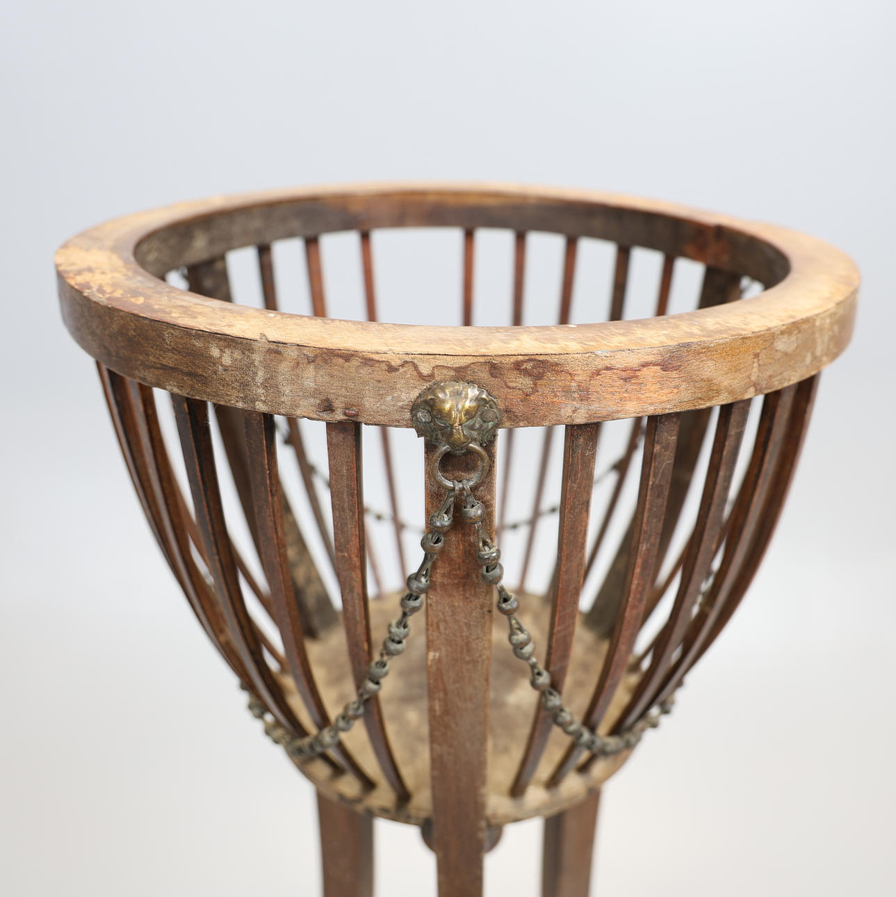 Oviform with a slatted body, 3 bead garlands suspended from lion masks and rings, turned pendant below, on 3 splayed legs joined by an undertier, H.91 x Dia.34cm.