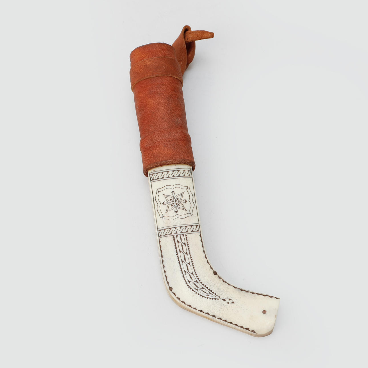 Reindeer horn, leather and wood, length with pod approx. 22 cm.