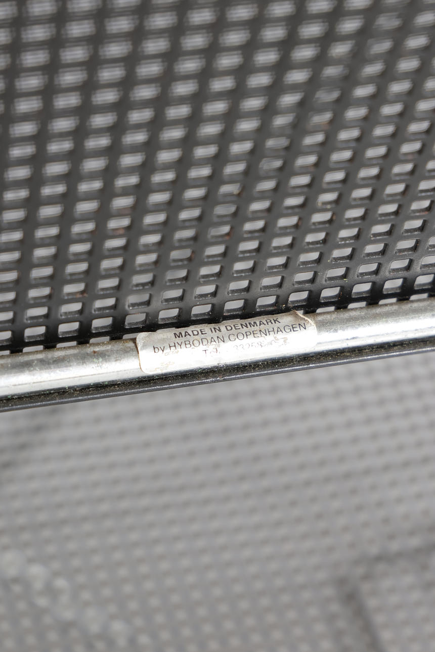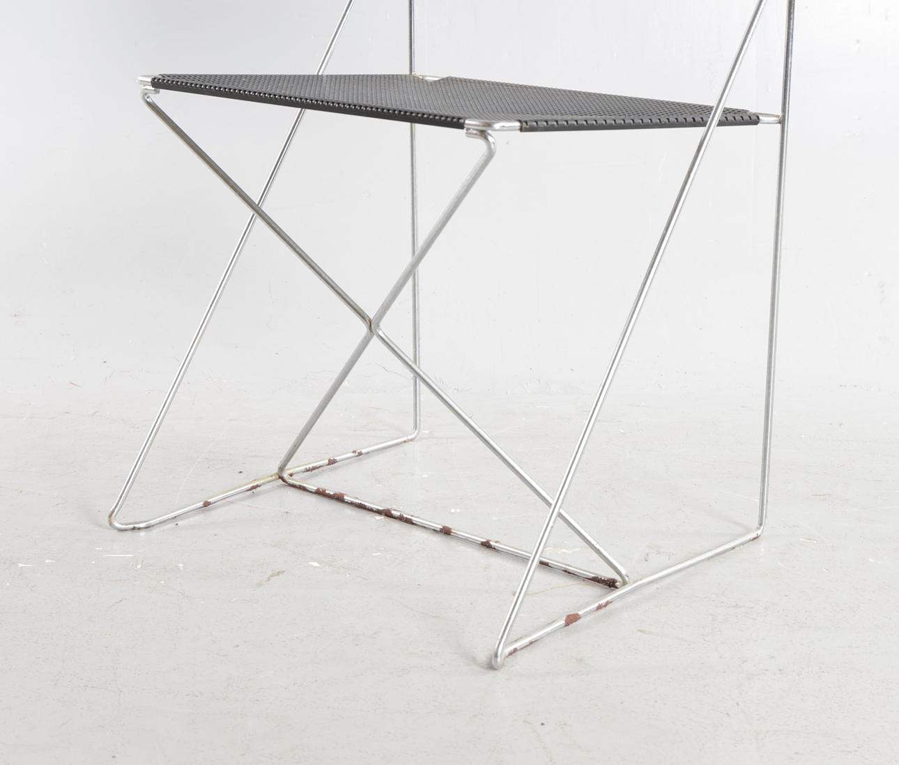 4433809. NIELS JØRGEN HAUGESEN. Five stackable dining chairs with steel frame, black lacquered metal seat and back. Designed in 1977. Manufactured and marked at Hybodan, model X-line (5).