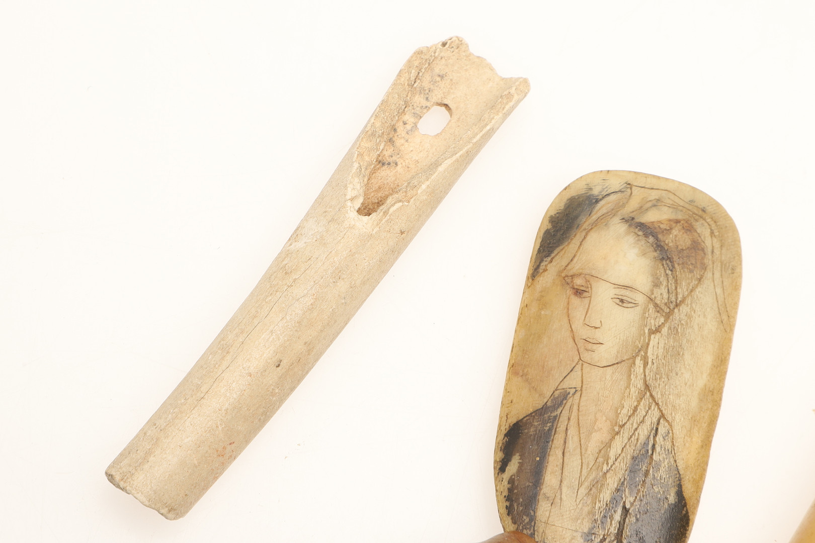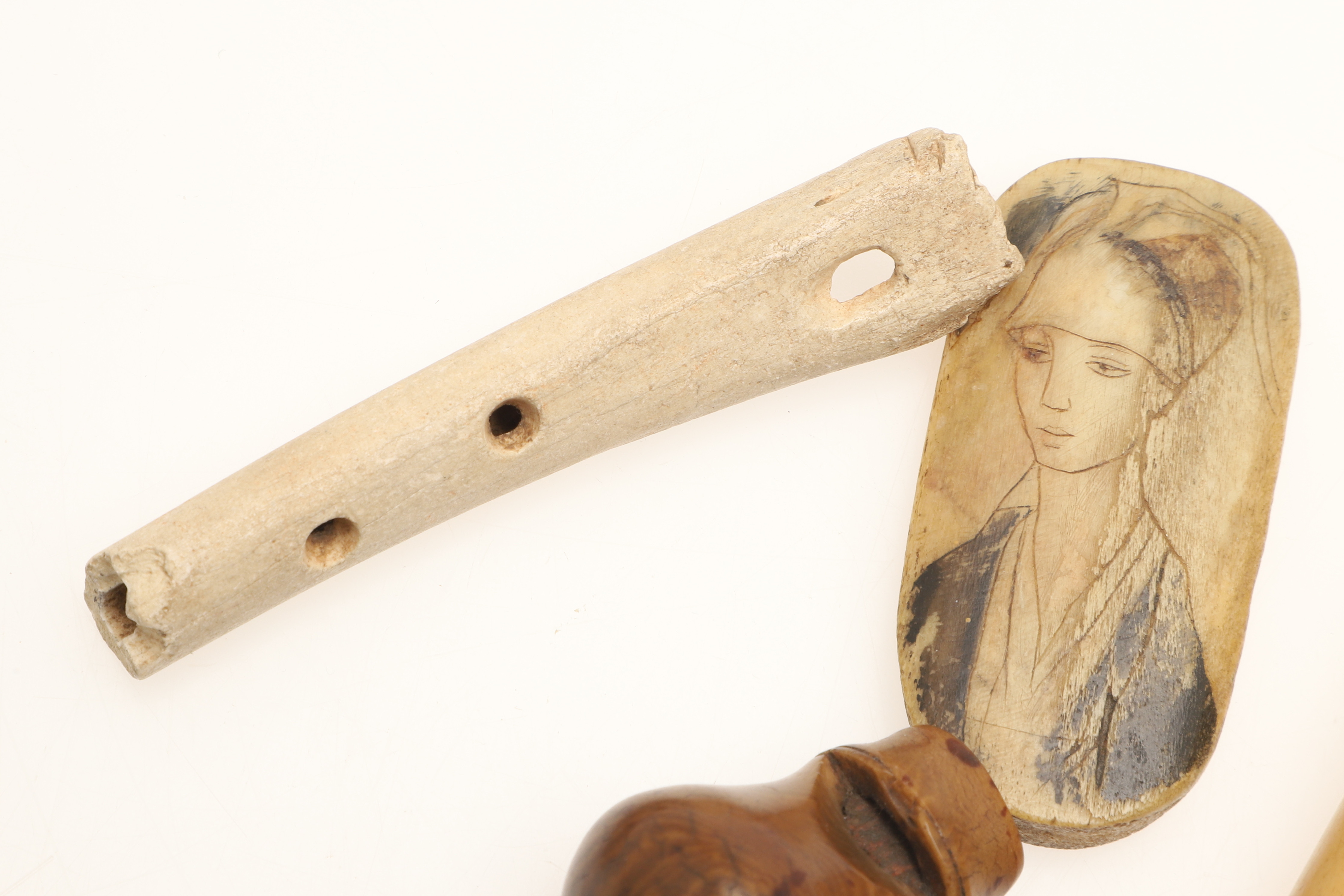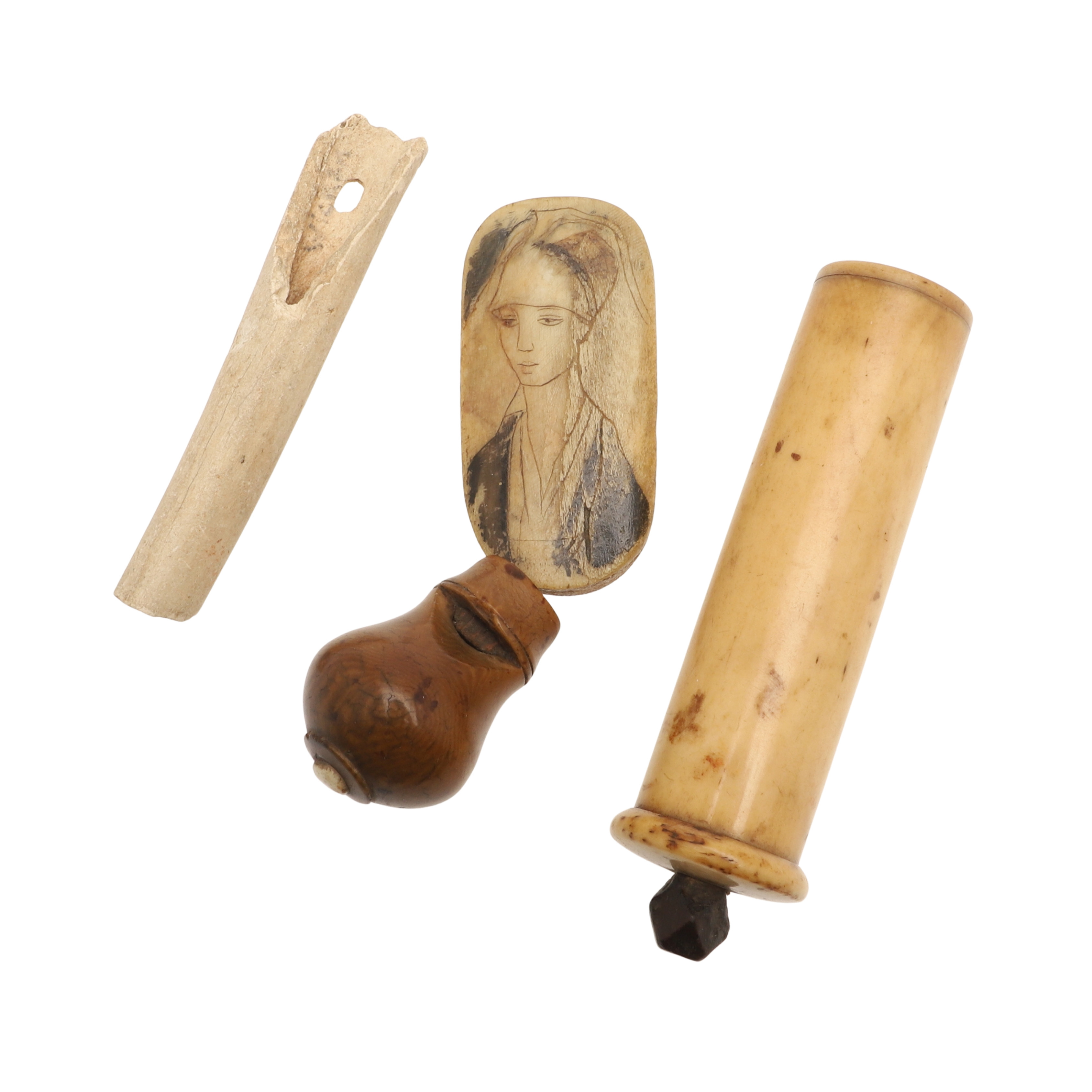 4434085. A COLLECTION OF CARVED BONE ARTEFACTS TO INCLUDE A NEEDLE CASE.
