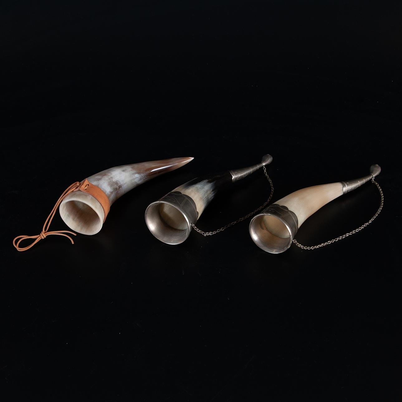 20th century, all in polished horn. Two with decorative fittings in engraved metal, finished with spout shaped like animal head and chain for hanging. The third horn with newer leather suspension.