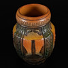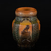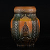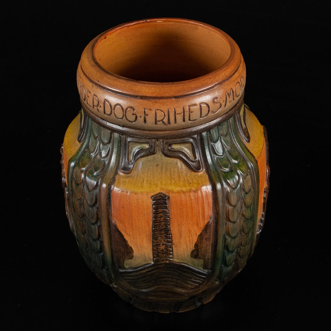 Large relief decorative pot in powerful Art Nouveau style. Motifs in relief with a national romantic touch: lions, mills, sculptures and pillars — divided into fields with text around the edge: