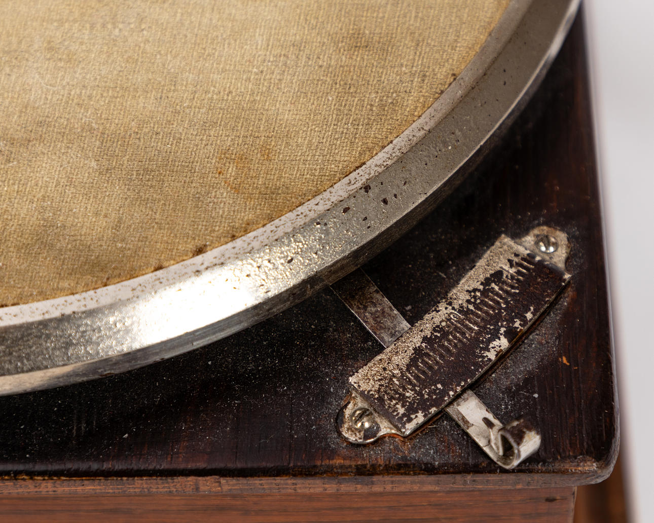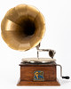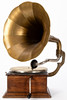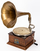 Wood, brown glazed, cast iron, metal, partly gold bronzed. Square body over contrasting, profiled frame strip. Velour pad on the turntable, swivel tonearm. The funnel with vertical trains. Mechanical winch drive HxWxD: approx. 56x30x30cm.