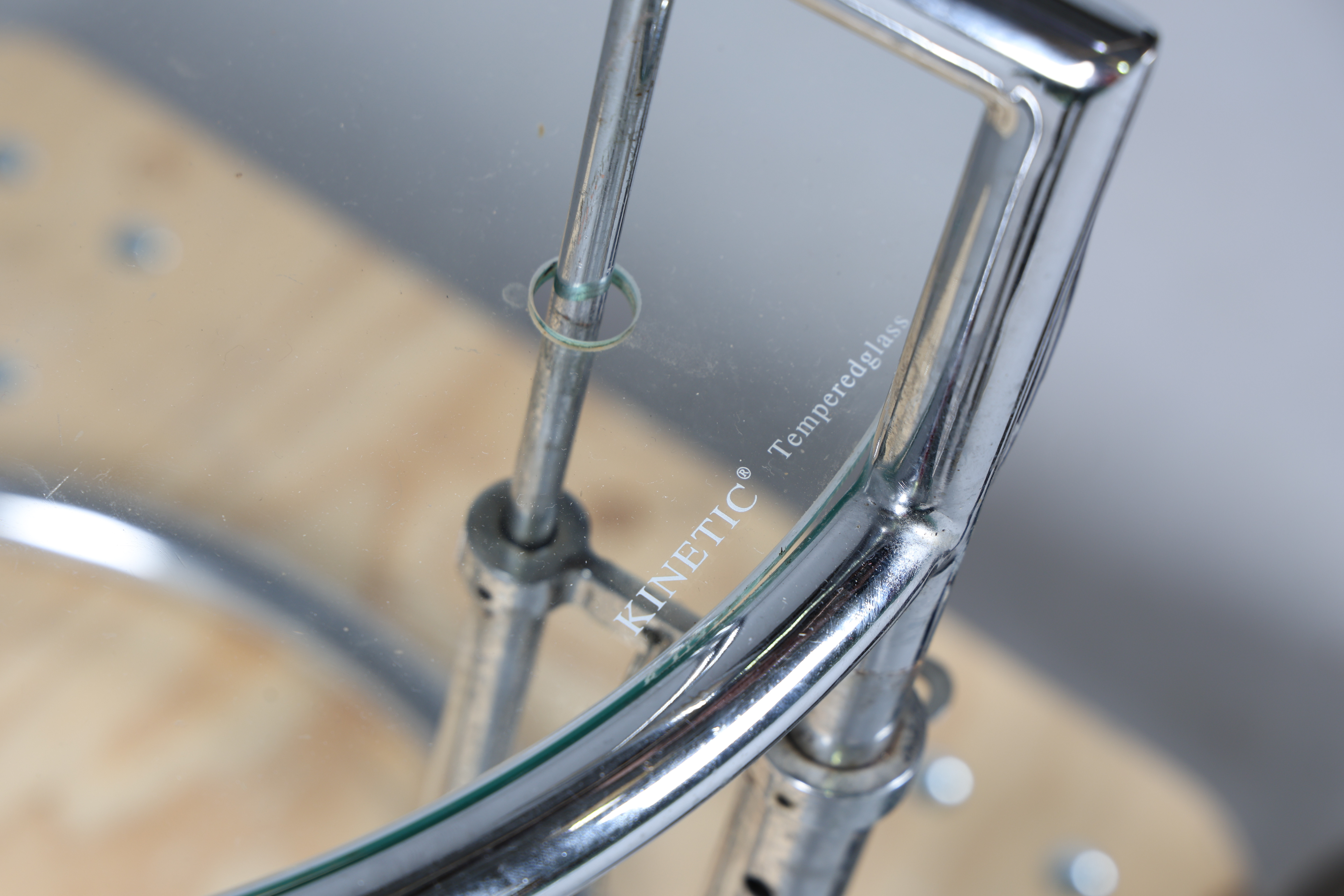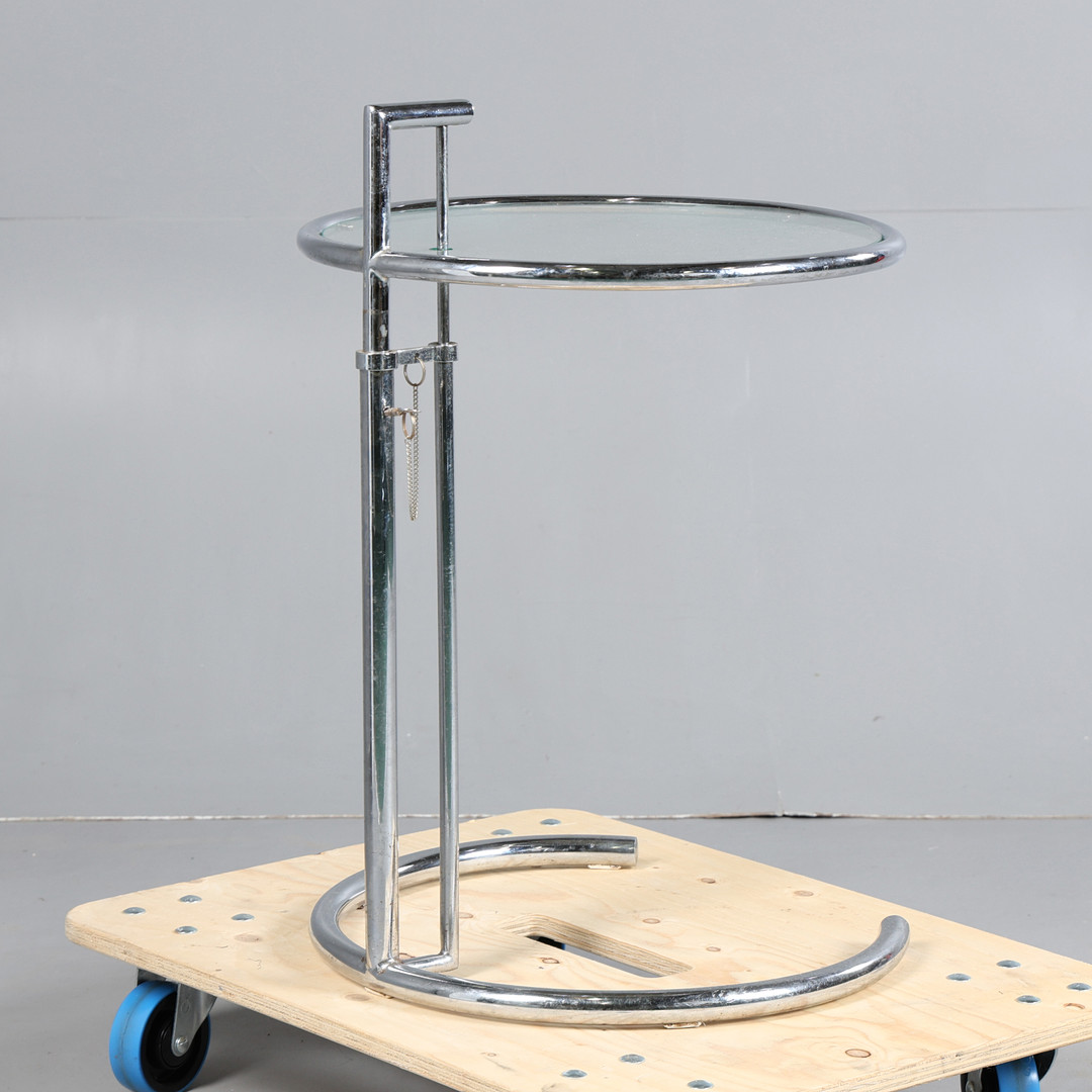 4434758. AN ADJUSTABLE CHROME AND GLASS SIDE TABLE.
