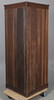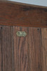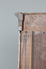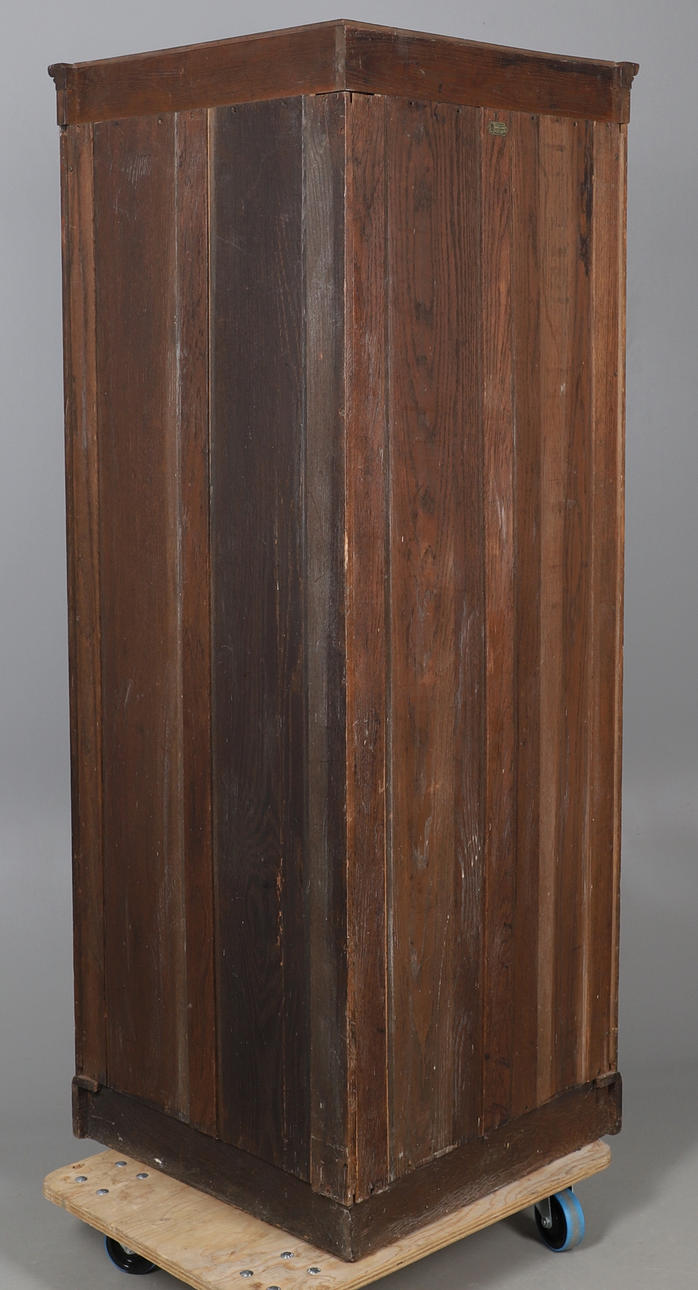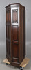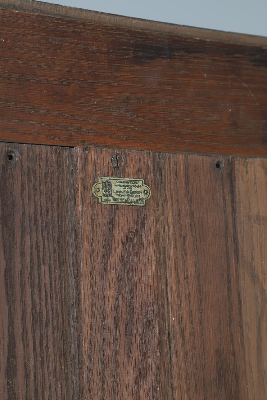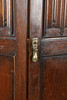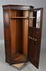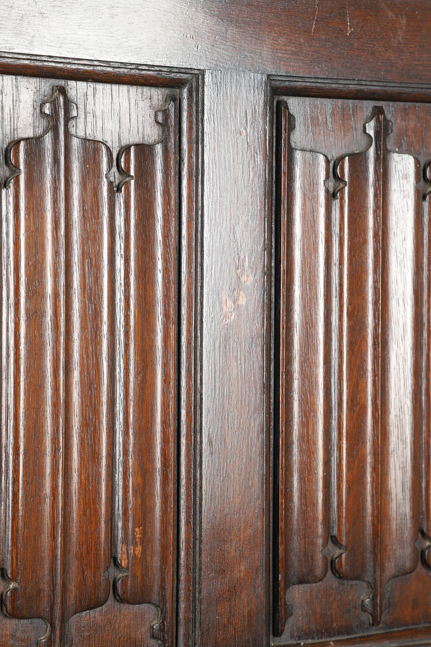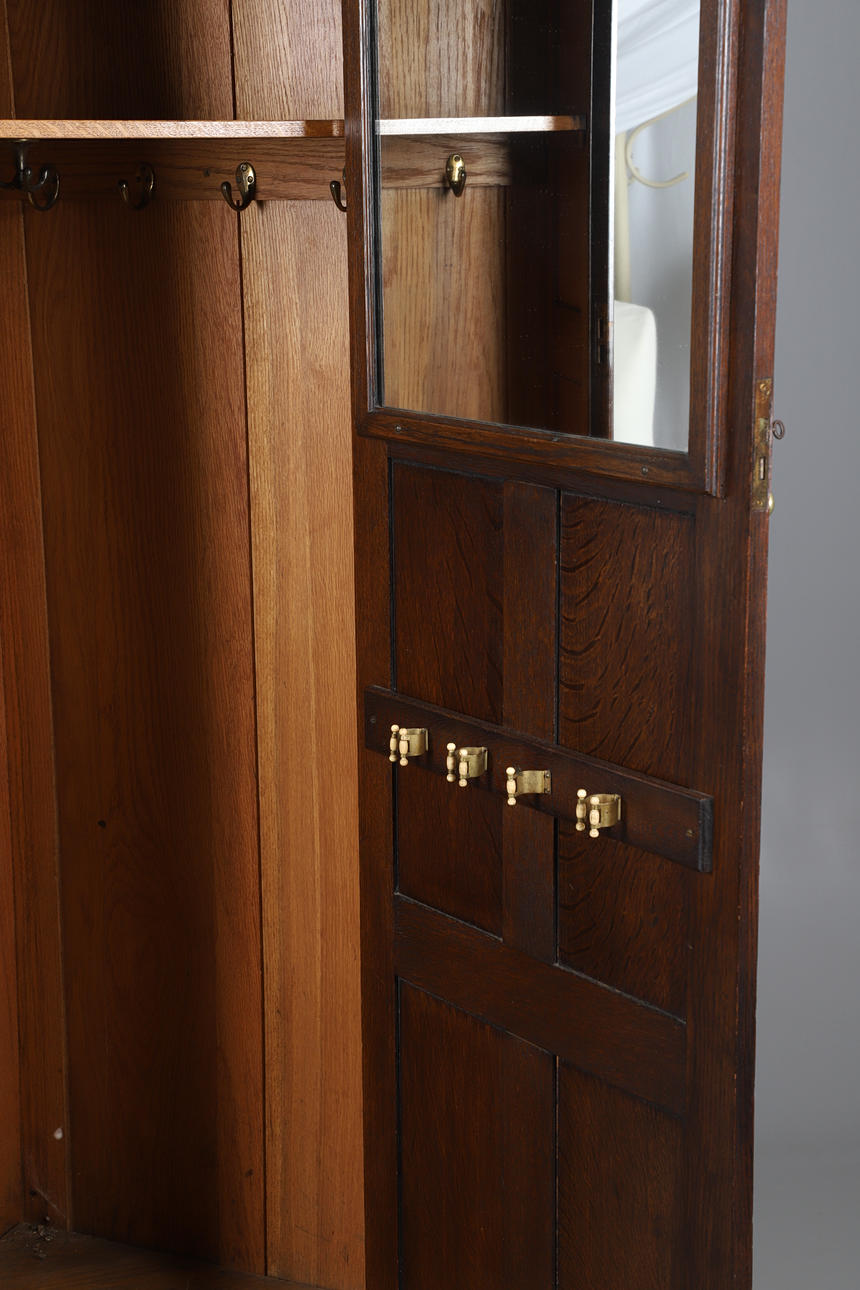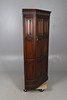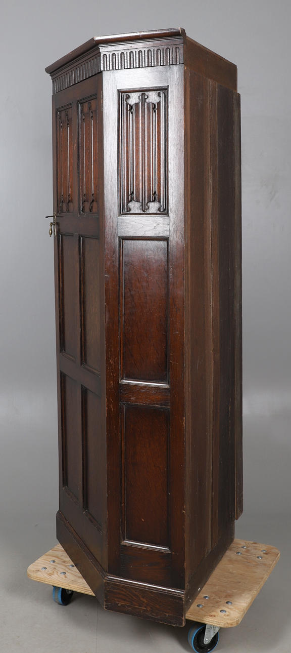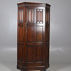 A floor standing oak corner cupboard with linen fold panels, with an internal shelf and hanging hooks. With a retailers label to the reverse. 182cms high, top 97cms across.