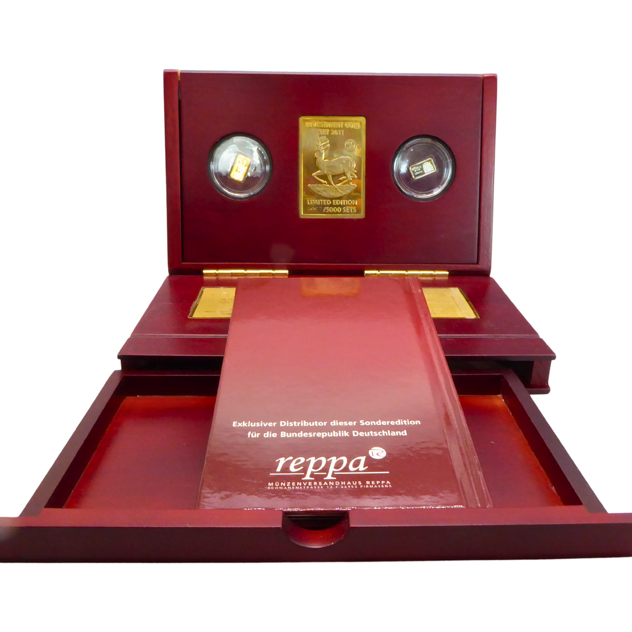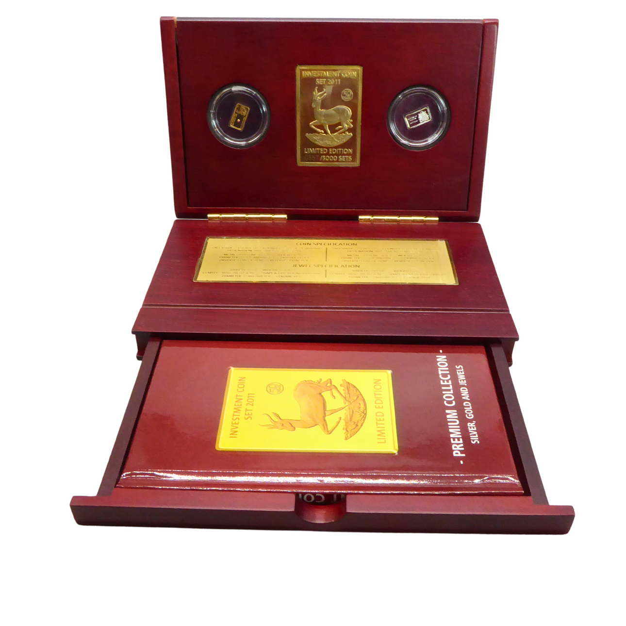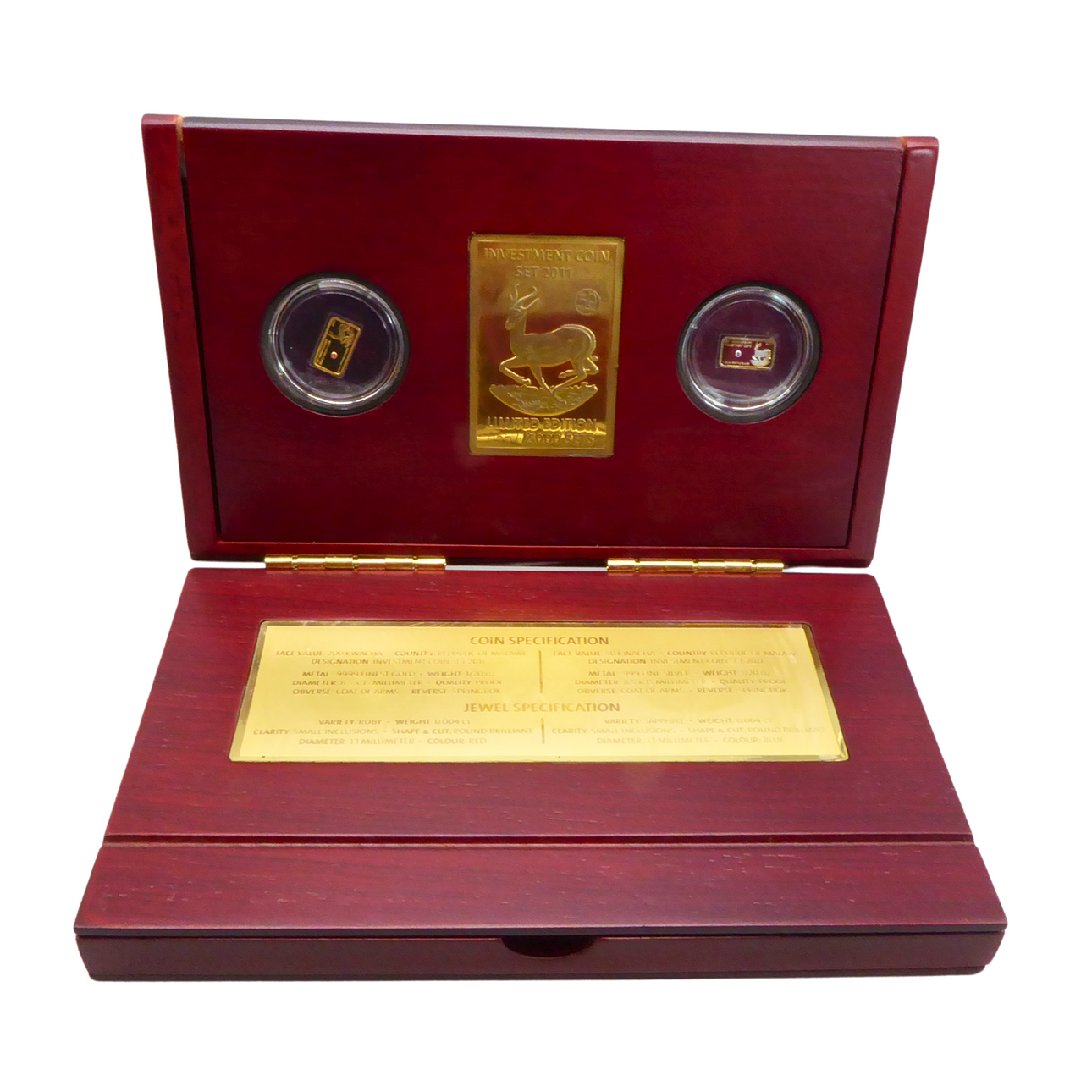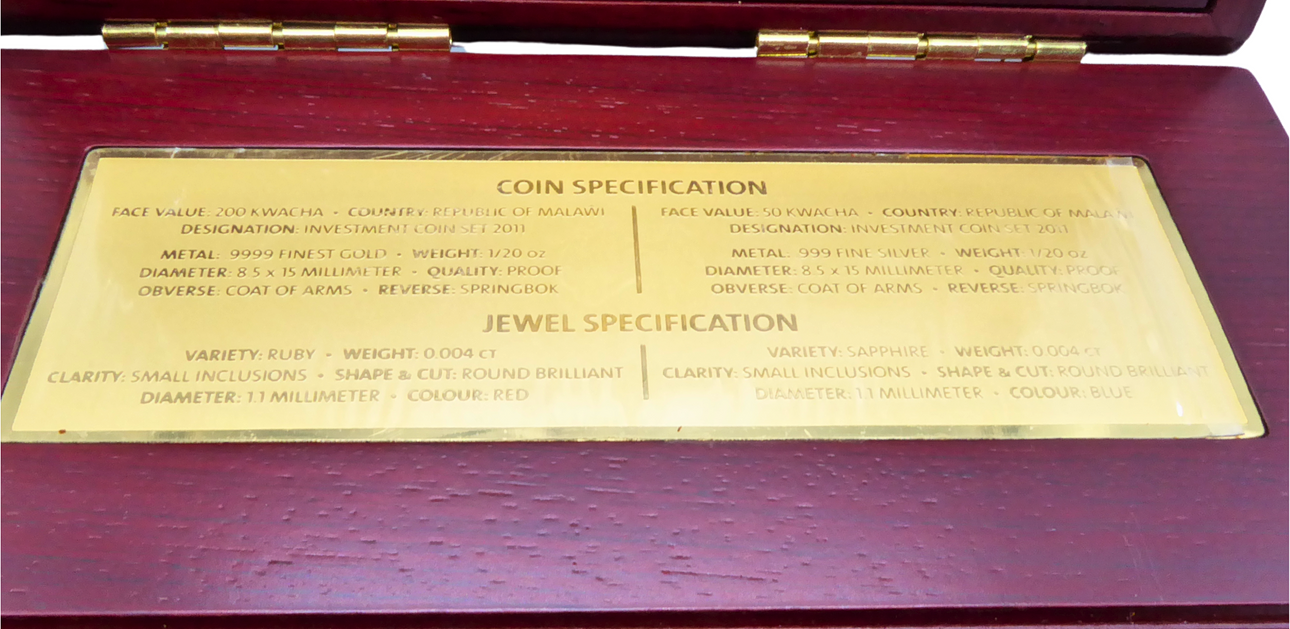 1/20 ounce Au fine, Malawi 200 kwacha, springbok motif. Plus 50 kwacha as 1/20 ounce of fine silver. In an elegant wooden box, with gemstone appliqué.