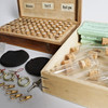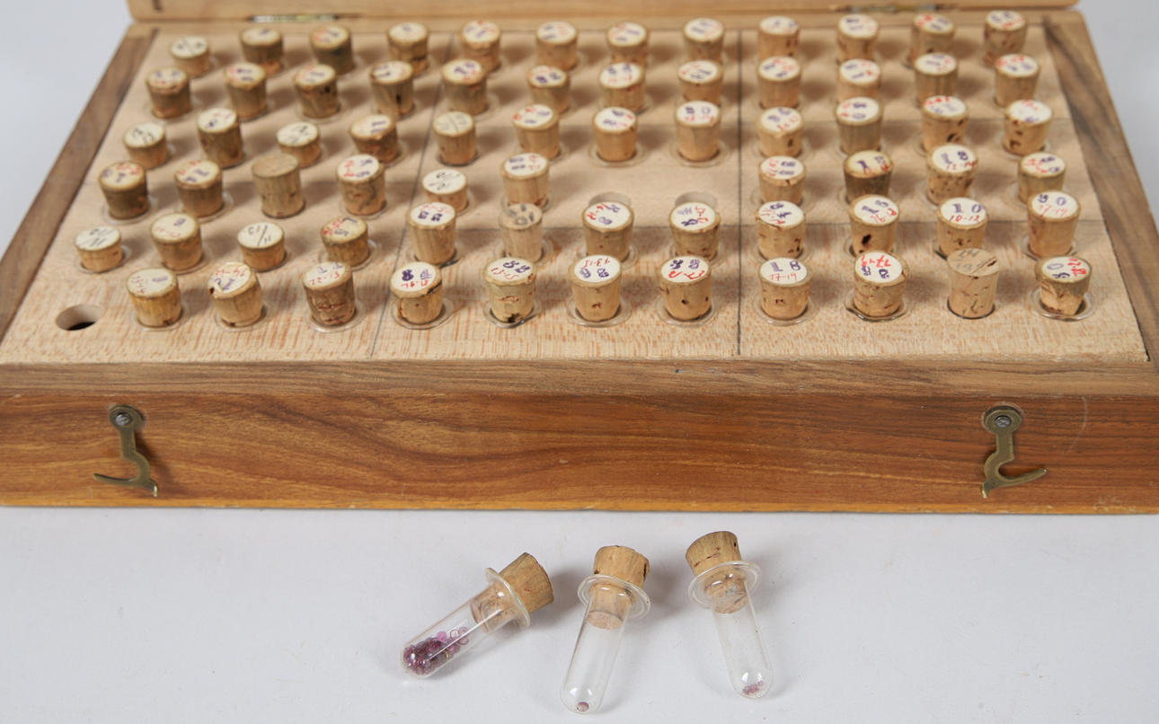Case, approx. 21,5x13,5x4 cm, with 72 small tubes, length excl. cork approx. 22 mm. partly with stones in it.