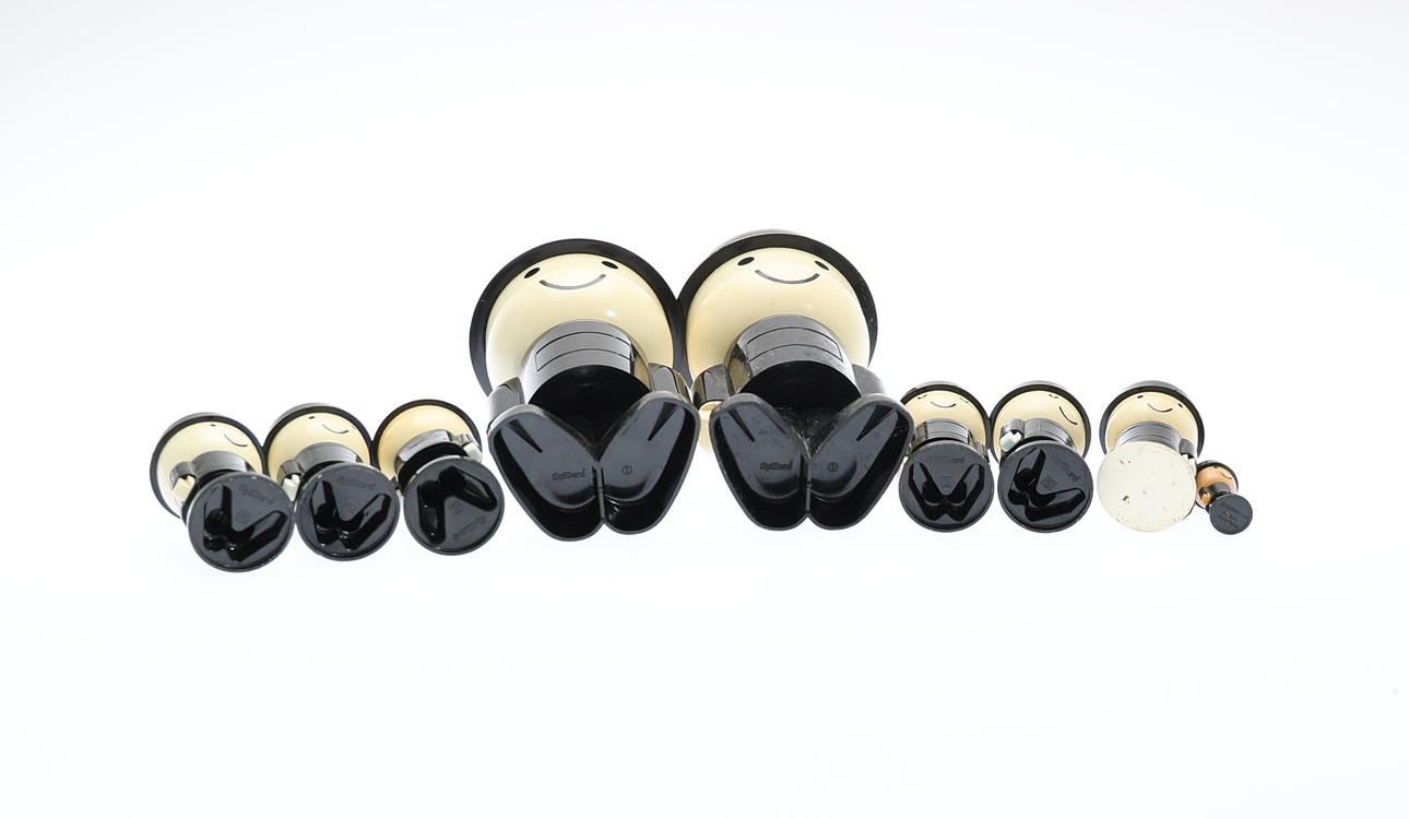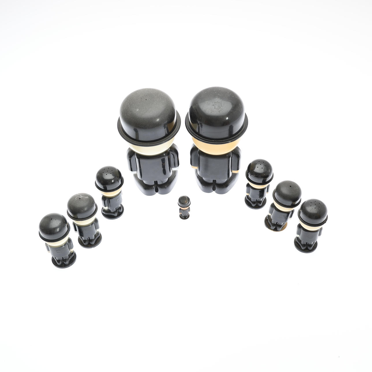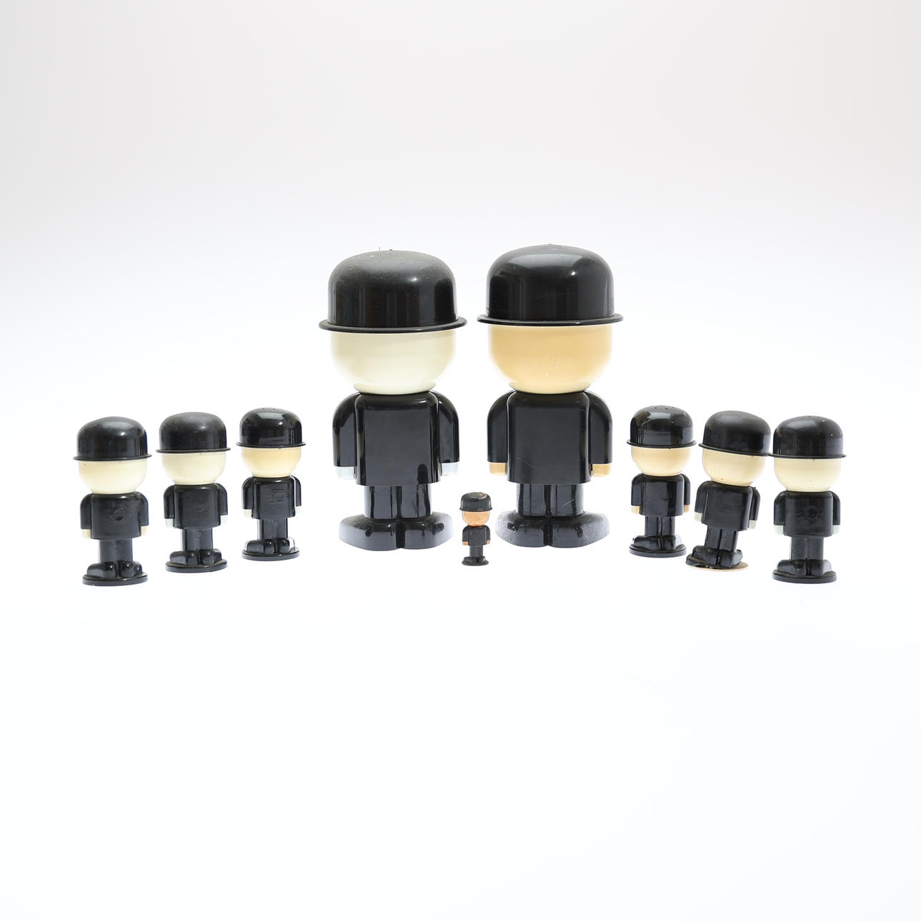 by Spillers, circa 1970s, to include two flour sifters, three salts, three peppers and a miniature figure, height of tallest 21cm. (9).