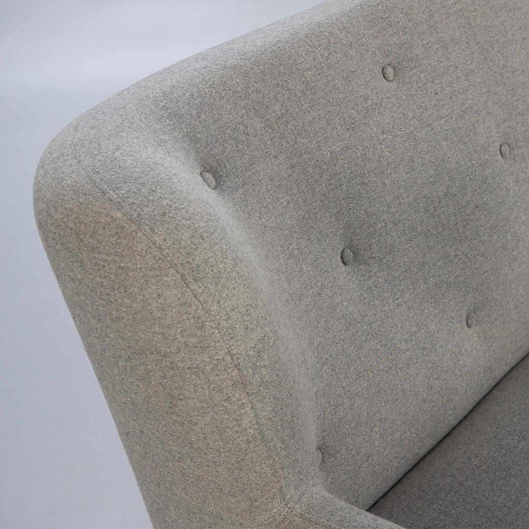 Padded construction, covered with grey fabric and padded backrest. Roundwood feet.