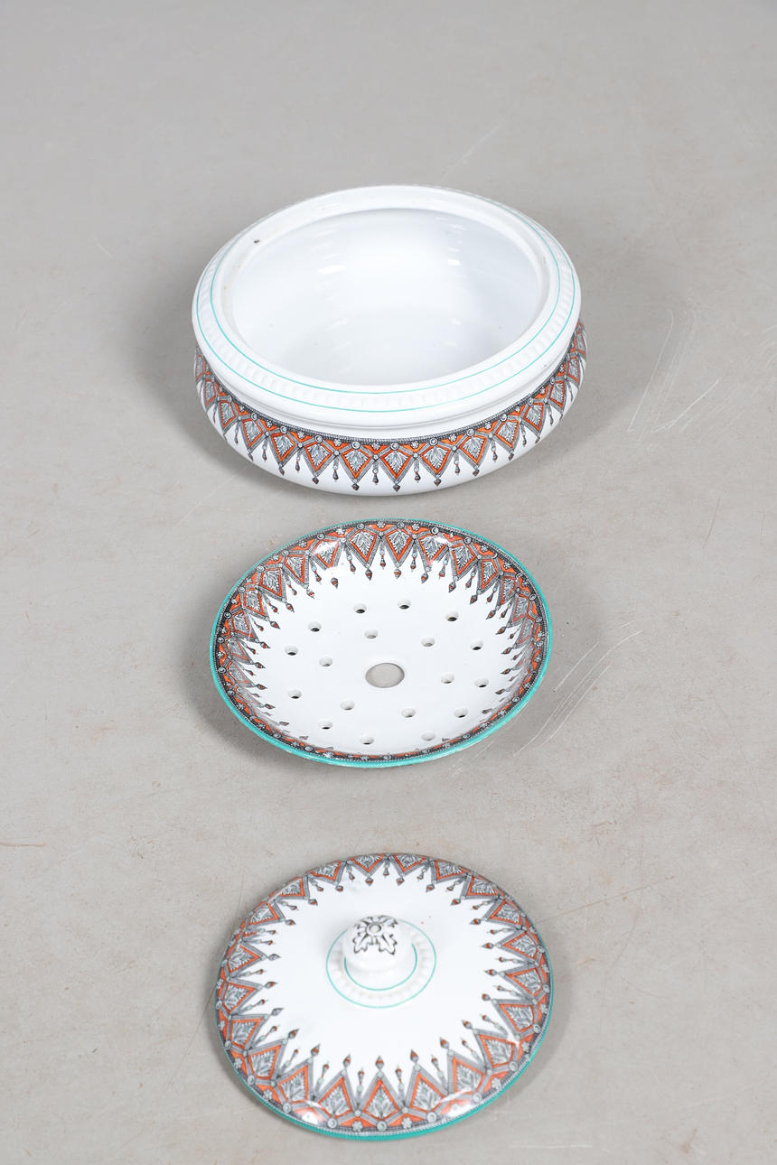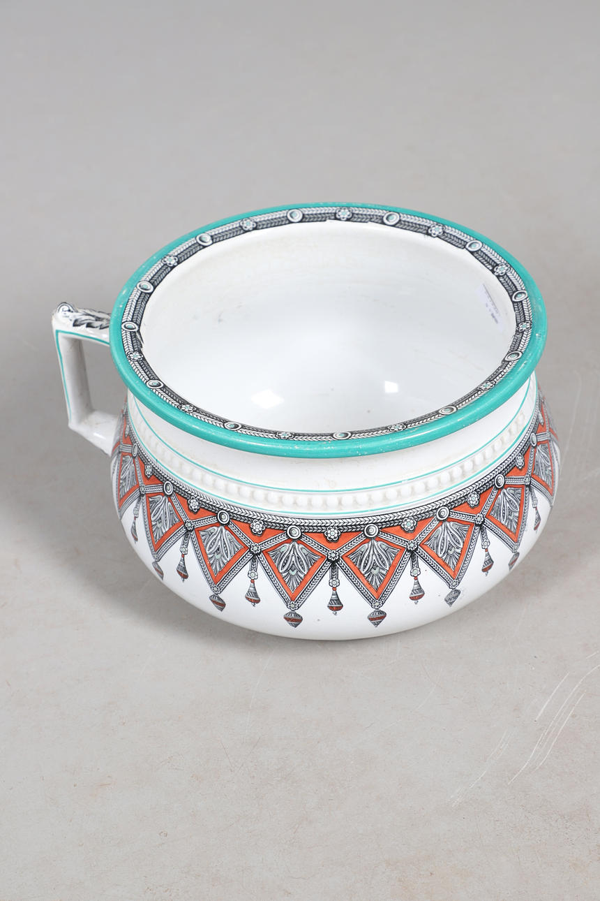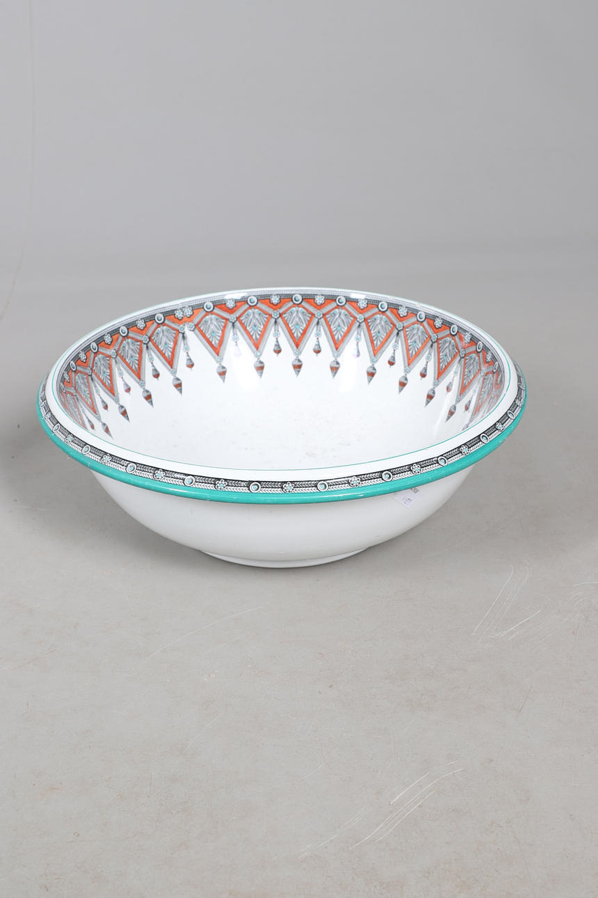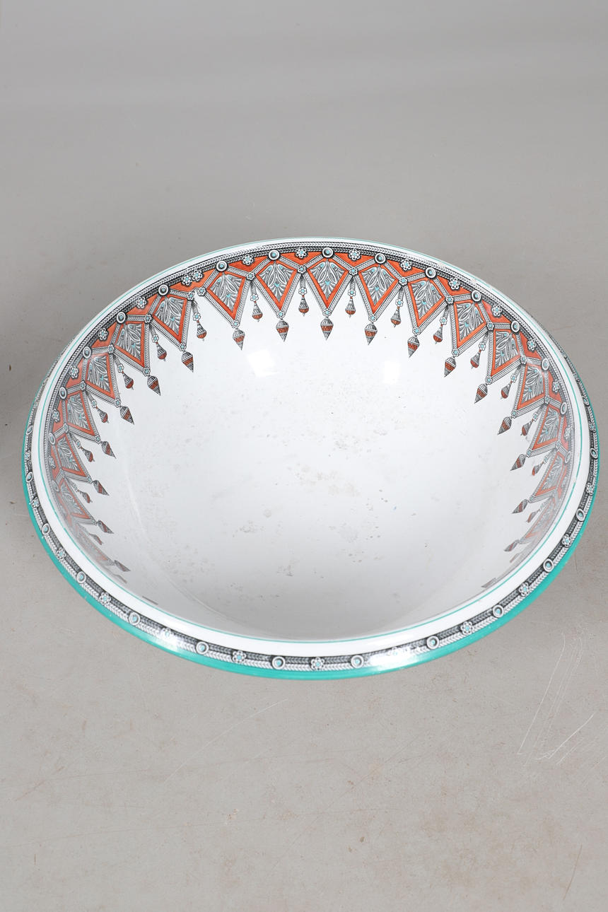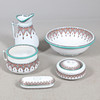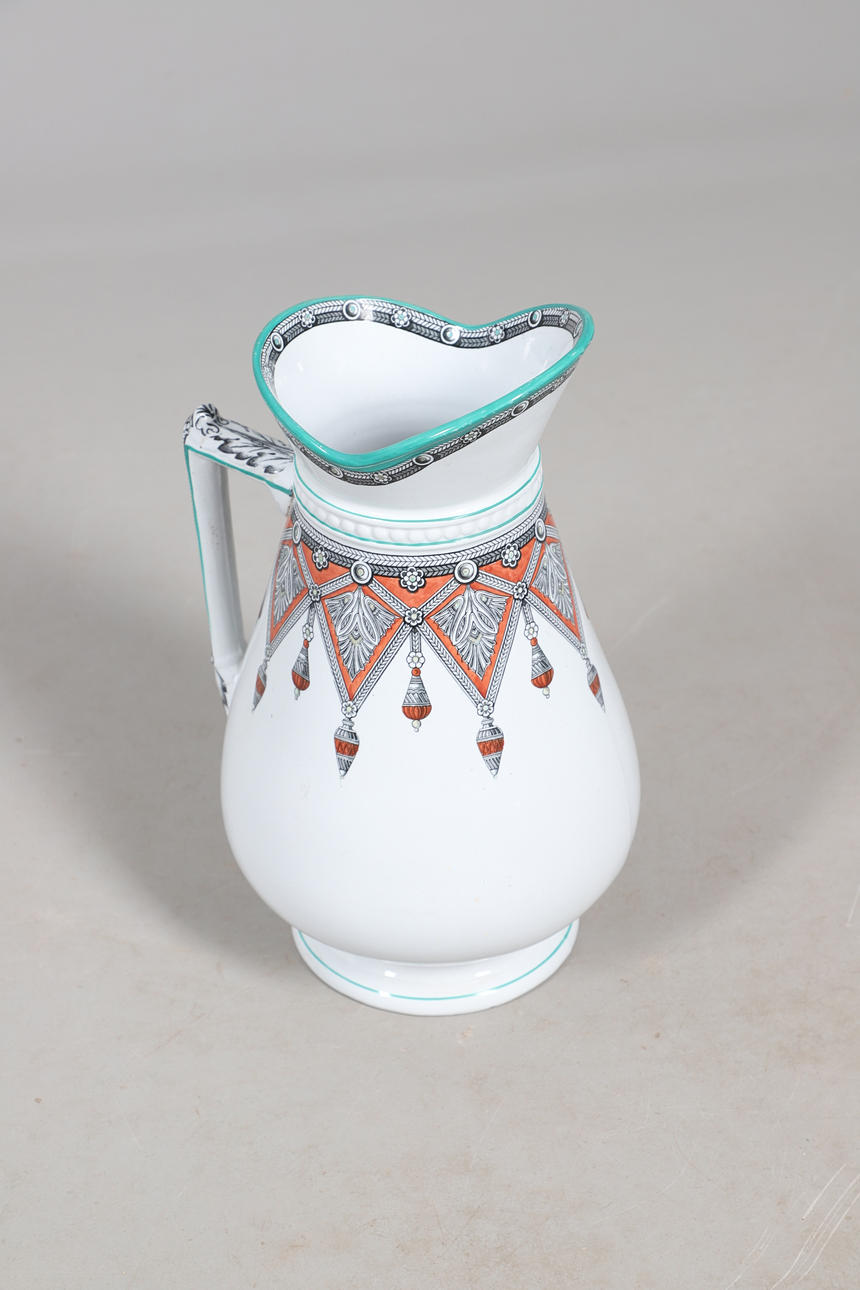 To include washbowl (diameter 40cm), jug (height 33cm), and other pieces. All with a foliate patterned design.