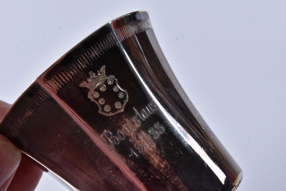 decor of vertical crests, engraved decoration of the coat of arms of the noble family Staël von Holstein, h 6 cm, weight 71 grams.