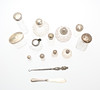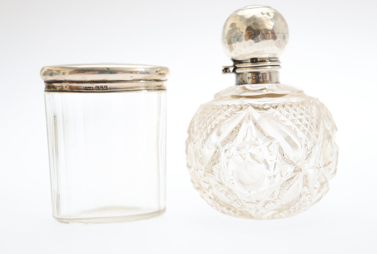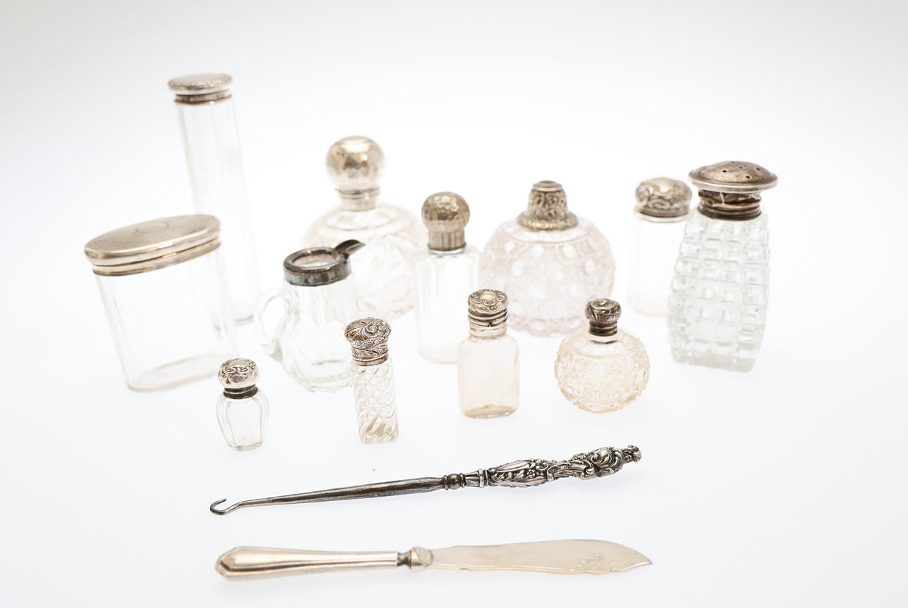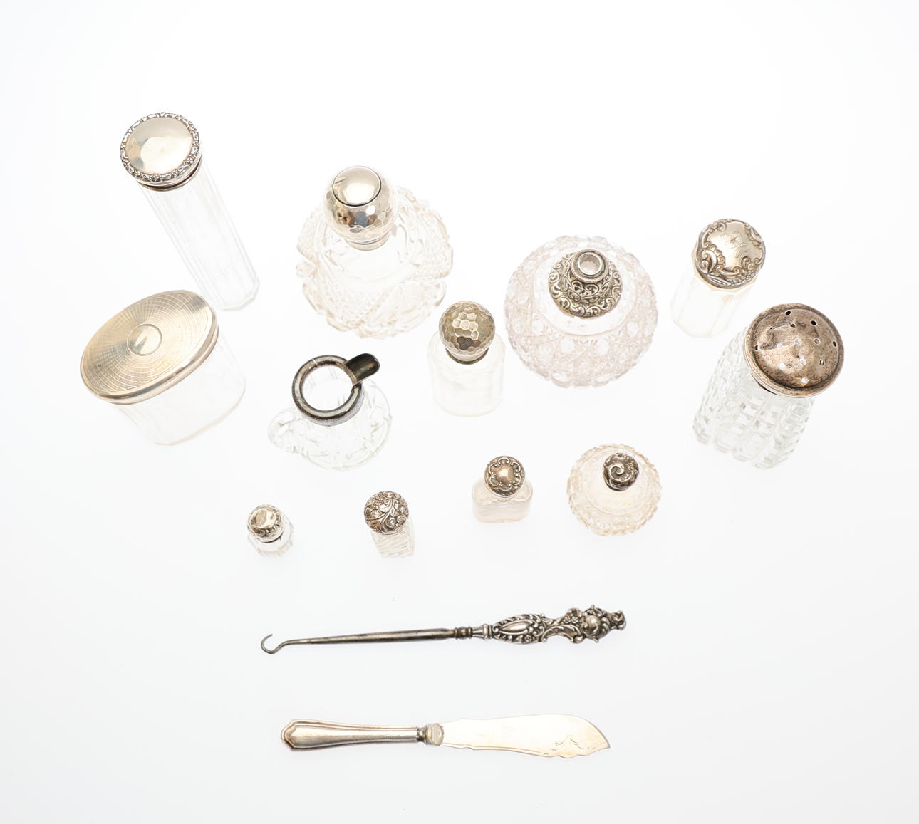 A parcel lot of assorted hallmarked silver and white metal mounted clear glass dressing table and scent bottles to include hat pin and other examples, sugar castor, small jug, and 2 silver handled items, H.16.5cm the tallest. (14).