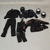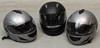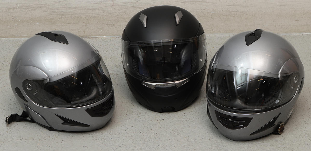 Helmets, 3 pcs. size 55-56. Motorcycle Jackets, 3 pcs. size M-L, Mc-Pants, 2 pcs. size M-L. Gloves, one pair, XS.
