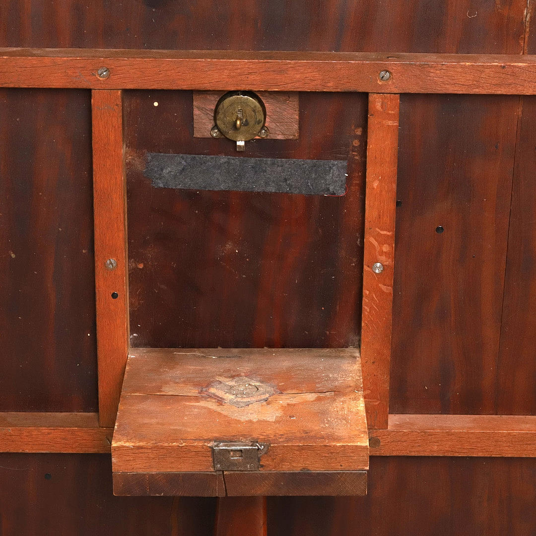 Age and use wear, abrasions, marks, surface dirt. Separation occurs on the table top, needs to be addressed. Challenging locks.