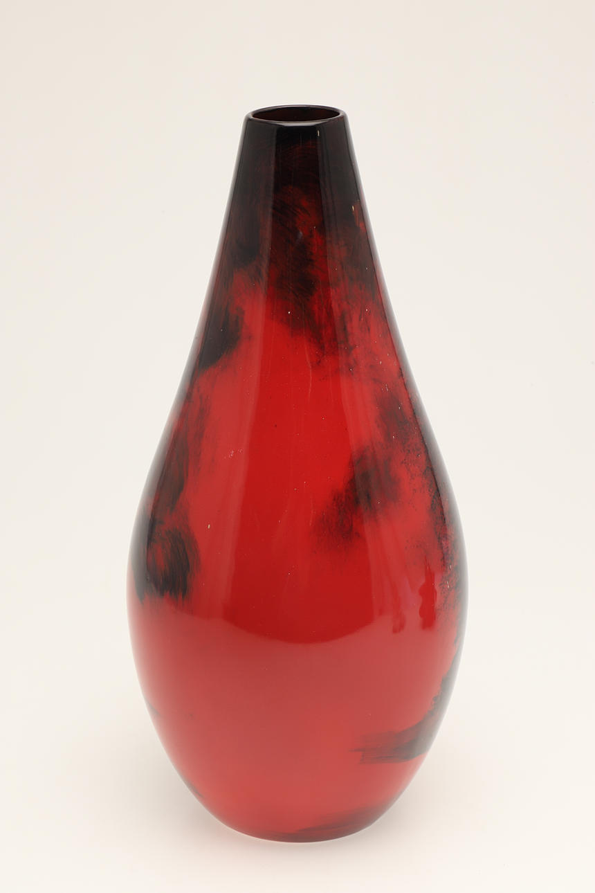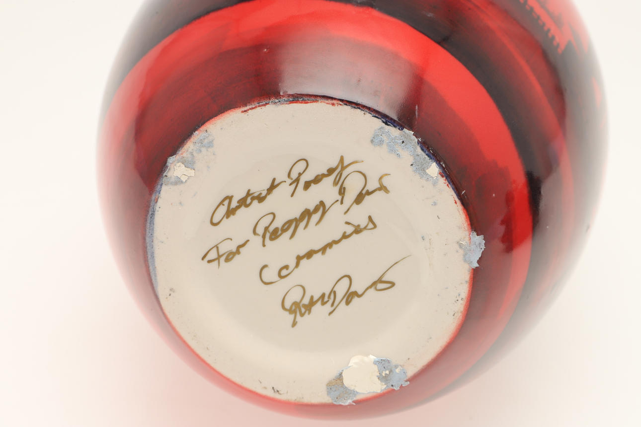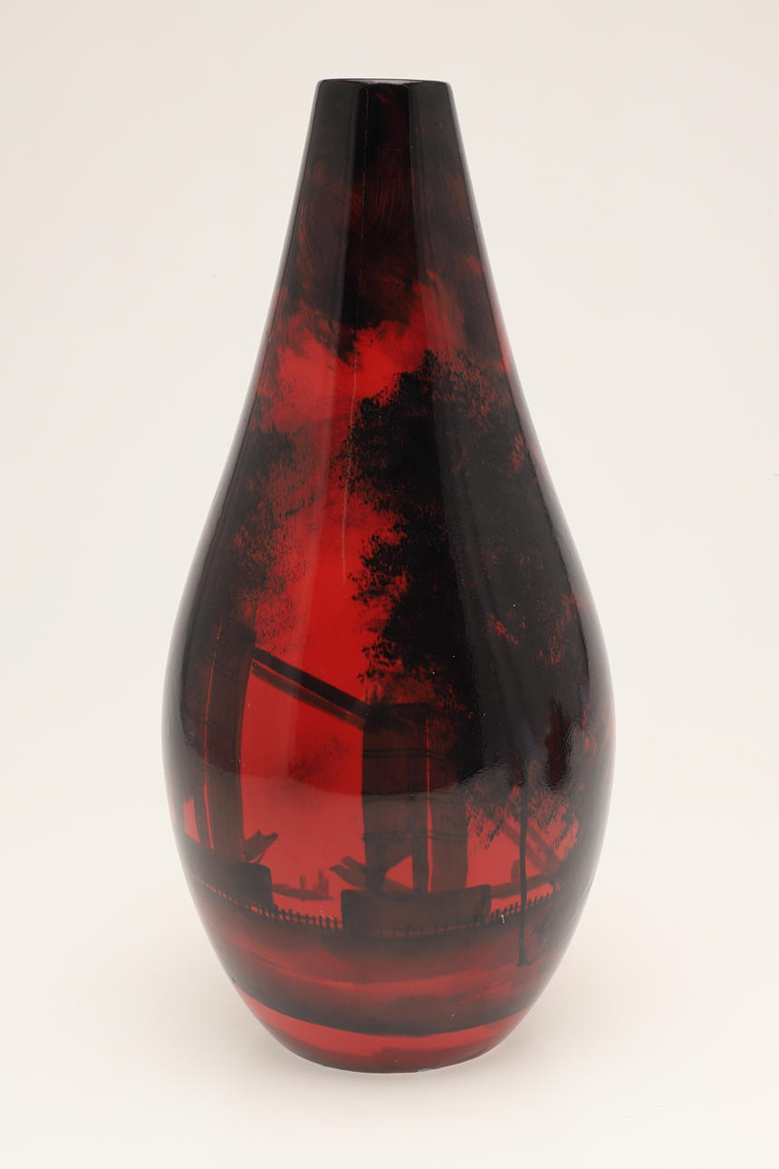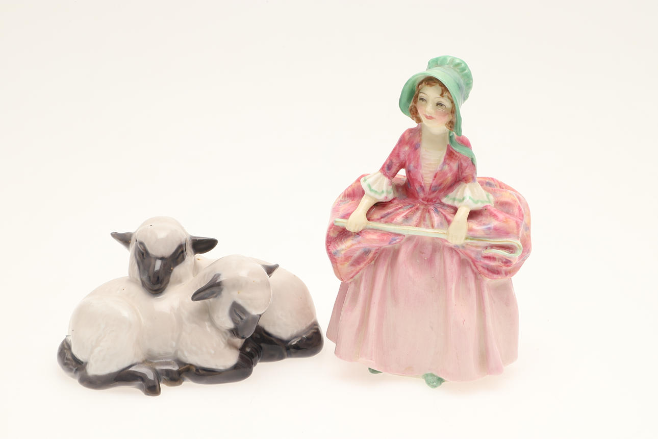 A mixed lot including a Carltonware Red Baron teapot (14cms high), a large signed flambe style vase (38cms high), Royal Copenhagen sheep group (10cms across), and a Royal Doulton figure of Bo Peep. (4).