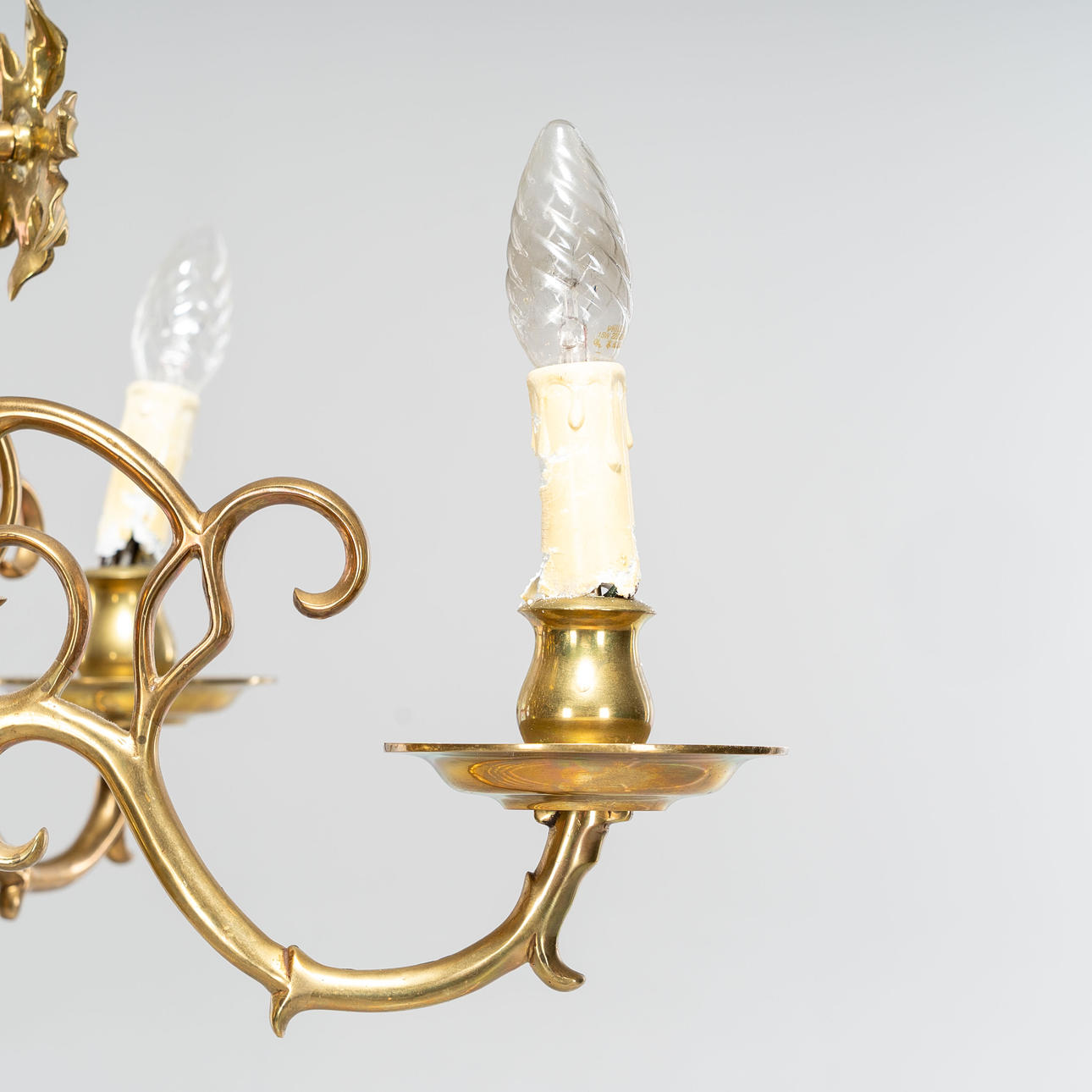 Electrified ceiling chandelier. Brass frame with five light arms