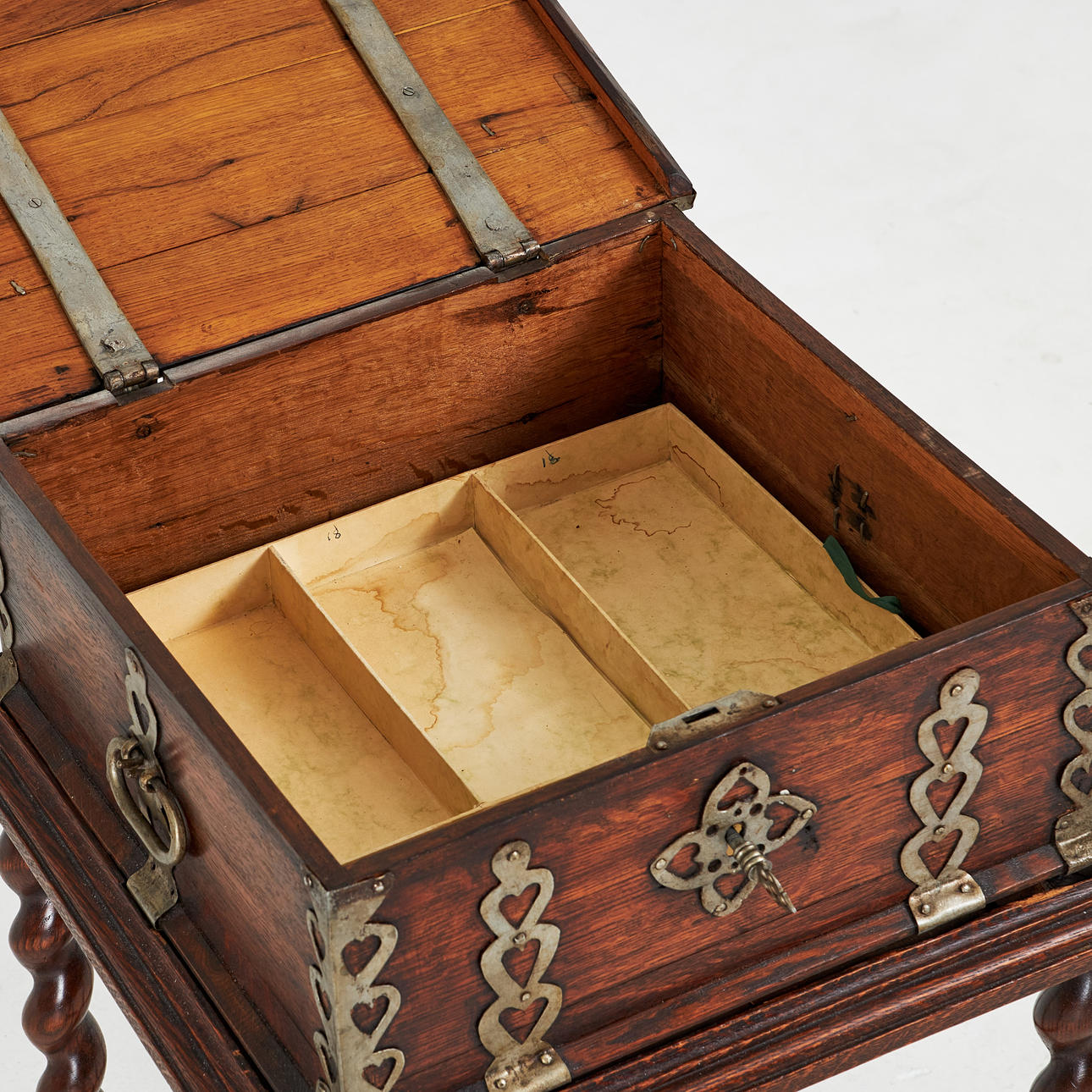 4440654. A 20th-century oak trellis, metal decor elements.